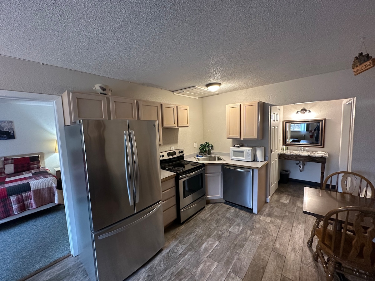 En entrant dans votre suite, vous remarquerez immédiatement l'ambiance accueillante et la décoration chaleureuse « Up North » qui vous accueille. La suite dispose de deux lits queen size confortables, chacun orné de draps haut de gamme et d'oreillers moelleux, assurant un sommeil réparateur et paisible tout au long de votre séjour. En plus des deux (2) lits Queen Size, nous avons soigneusement inclus un canapé convertible pratique.