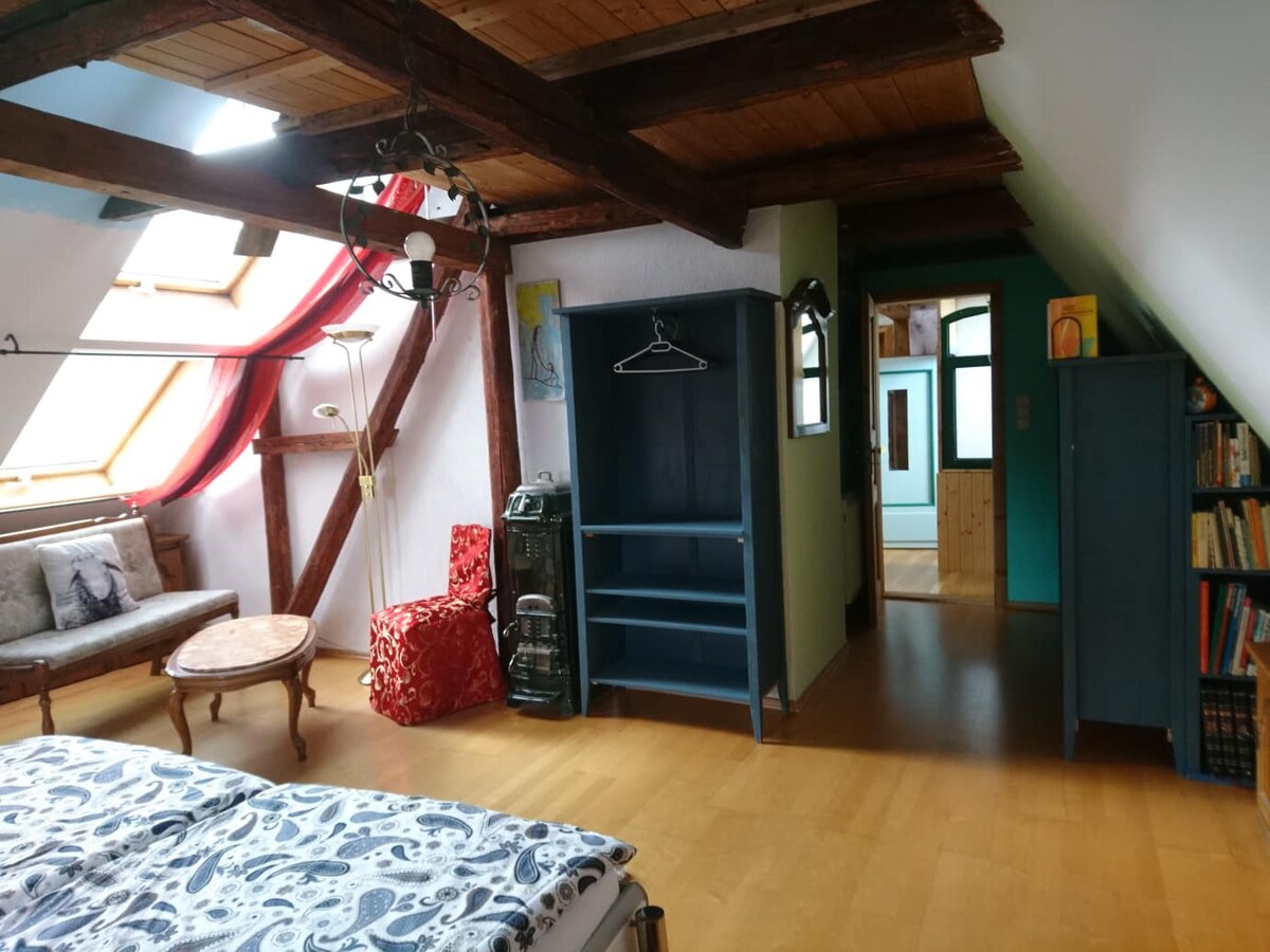 Détends-toi avec toute la famille dans ce logement idyllique au cœur de la nature. L'appartement est au dernier étage de la maison d'habitation d'une ferme à quatre côtés rénovée avec amour. La ferme est exploitée de manière biologique. Elle est habitée par plusieurs générations. Il y a des moutons, des poules et des pigeons dans la ferme. La ferme individuelle se trouve entre Leipzig, Dresde et Chemnitz.