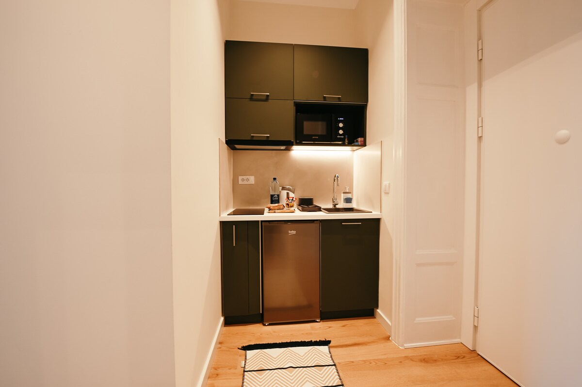 Appartement au design moderne idéal pour les couples ou les voyageurs d'affaires qui veulent le confort, la paix et la proximité de la ville. Un salon spacieux avec un canapé confortable, une télévision connectée et un bureau, idéal pour la détente ou un environnement de travail productif. Cuisine moderne entièrement équipée avec tous les appareils et ustensiles nécessaires pour préparer les repas. Une chambre confortable avec un lit double et une literie luxueuse. Un éclairage ambiant discret contribue à une atmosphère relaxante.