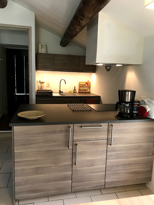 Le logement est une partie du Mas avec une entrée indépendante et sa propre petite piscine (non partagée) et ses deux terrasses. Il fait environ 45m2, comprend une grande chambre avec télévision, un espace rangement, un coin cuisine et une grande salle de bain et sa douche à l'italienne. Tout l’espace est ouvert, il n’y a pas de séparation entre la chambre et le coin cuisine. La terrasse est orientée Est, très agréable en été. Elle surplombe la piscine octogonale de 3,50m.