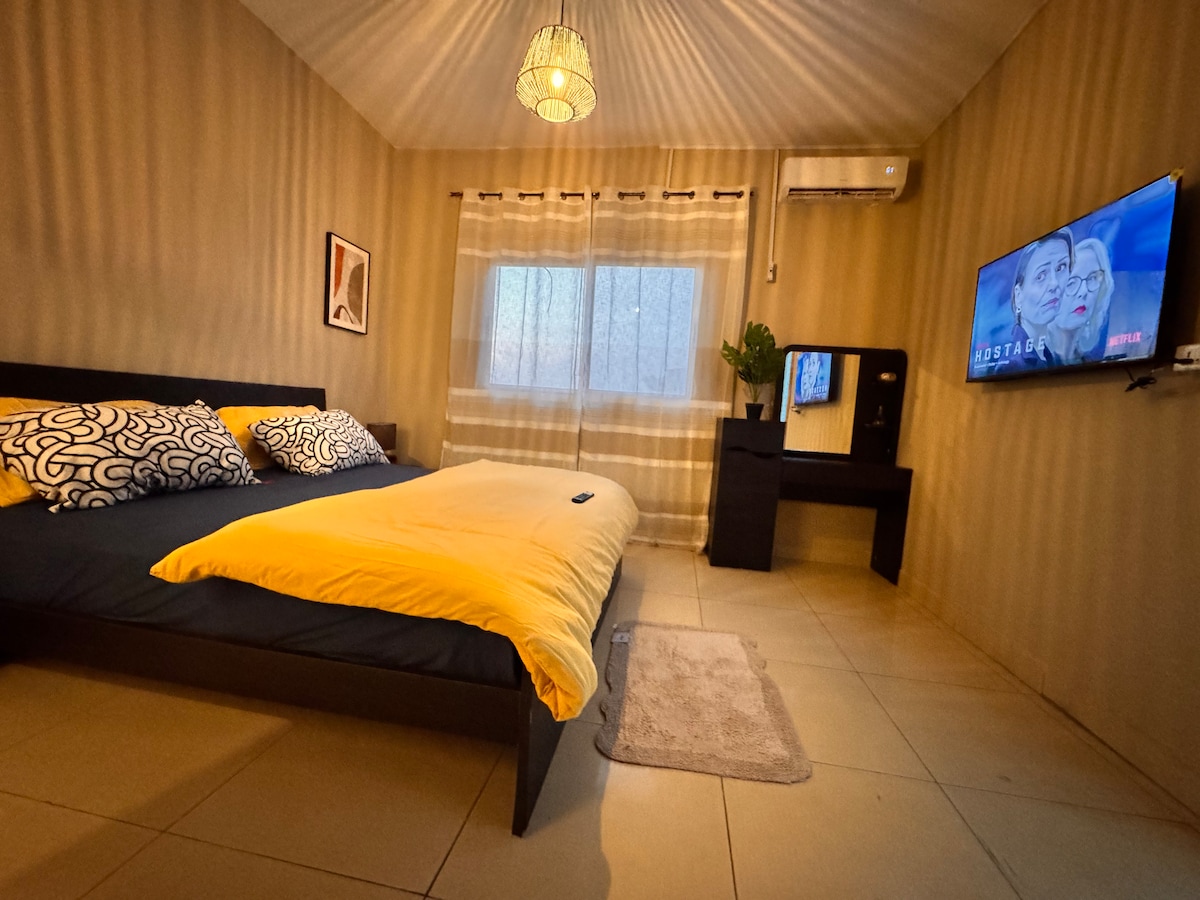Un séjour économique pour les voyageurs décontractés. Mon humble logement vous offre la possibilité de vous reposer, de vous ressourcer et d'explorer sans dépasser votre budget. Nous disposons d'un LEC 24h/24 et 7j/7 et d'un générateur de secours. Nous fournissons de l'eau courante chaude et froide, une CONNEXION WI-FI et une télévision intelligente. Nous disposons également d'un lave-linge pour vous garder au frais et propre sans tracas. Nous sommes dans une enceinte fermée et juste sur la route de retour de la ville du Congo près des ambassades, des casinos, des plages et des restaurants. Merci d'avoir choisi de réserver avec moi !