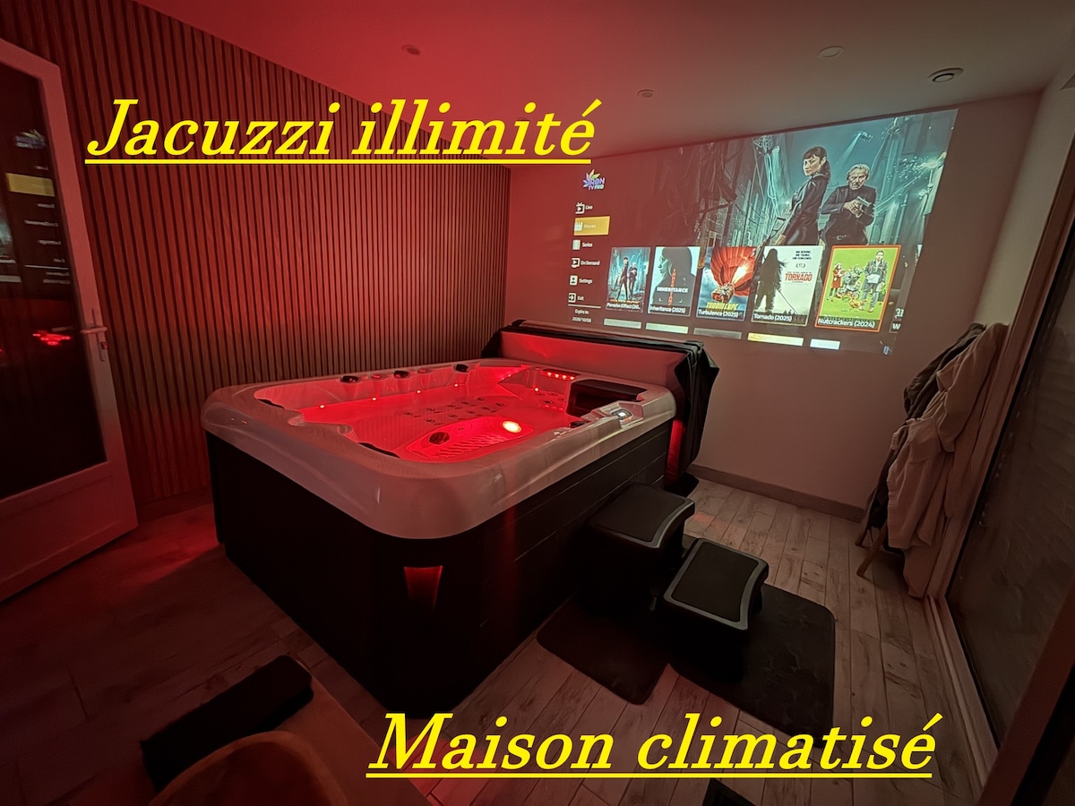 La maison dispose d'un vrai jacuzzi pas d'une baignoire balnéo. Vous pouvez l’utiliser autant que vous le souhaitez 😊 Maison entièrement climatisée. Vous disposez de toutes les séries et films Netflix, Amazon, Disney, Apple ainsi que de toutes les chaînes Canal + et Bein sport. Logement NON fumeur un espace dehors est aménagé.