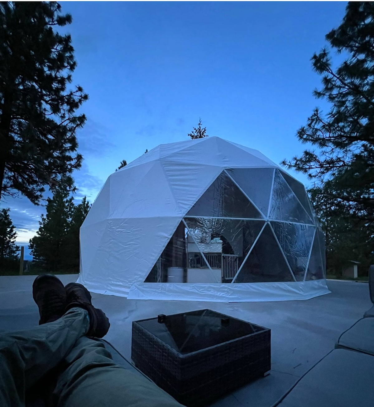 Niché dans l'étreinte de pins imposants, le dôme géodésique est une retraite de luxe unique qui allie harmonieusement la vie moderne à la tranquillité de la nature. Ce dôme bien aménagé est situé juste à l'ouest de Hamilton, offrant un équilibre parfait entre l'atmosphère vibrante de la ville et la beauté à couper le souffle des montagnes Bitterroot. Le spacieux patio en béton est un endroit idéal pour se détendre, où vous pouvez regarder les cerfs errer et écouter le doux cliquetis de notre sympathique troupeau de poulets.