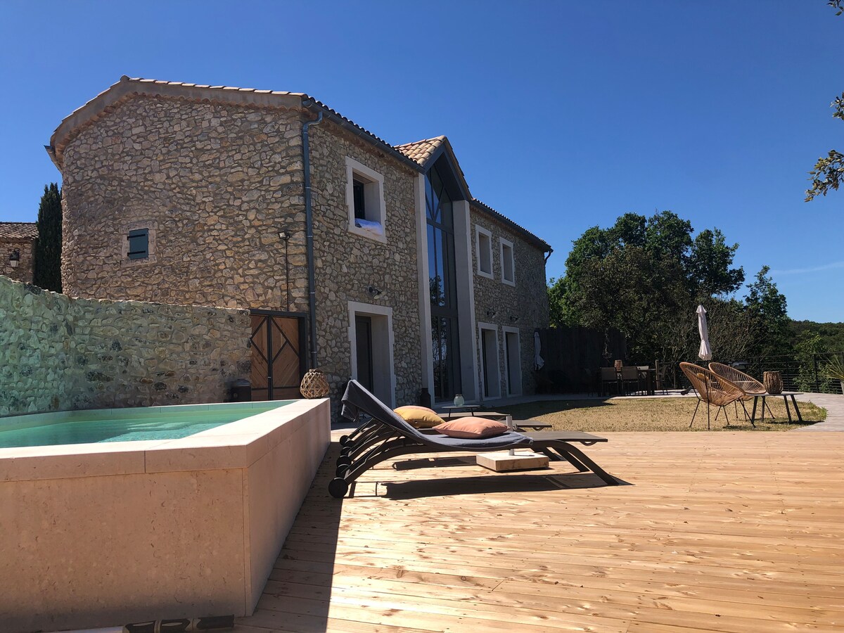 Joli Mazet independant en pierre avec SPA et piscine privative chauffée sans vis-a-vis et vue imprenable sur les vignes de la vallée de la Cèze! Petit coin de paradis pour 2 personnes. Situé proche de 4 sites classés "plus beaux villages de France". Goudargues -3 km.