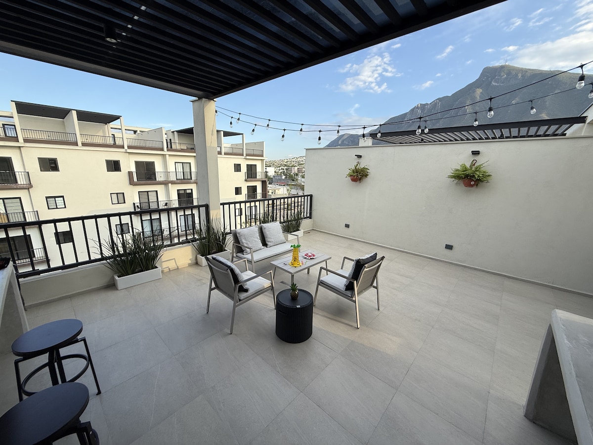 Loft moderne situé sur les pentes du Cerro de la Silla, belle vue panoramique sur les montagnes et la ville. Colonie privée et 100 % sécurisée, à proximité des zones commerciales et des principales avenues de la ville, à 15 minutes du centre de Monterrey, de Parque Fundidora, de San Pedro et de Santiago. Mobilier 100 % neuf, terrasse entièrement privée en plein air. Avec ce qui est nécessaire pour assurer l'approvisionnement en eau 24 heures sur 24. Nous avons également une excellente réception Internet.