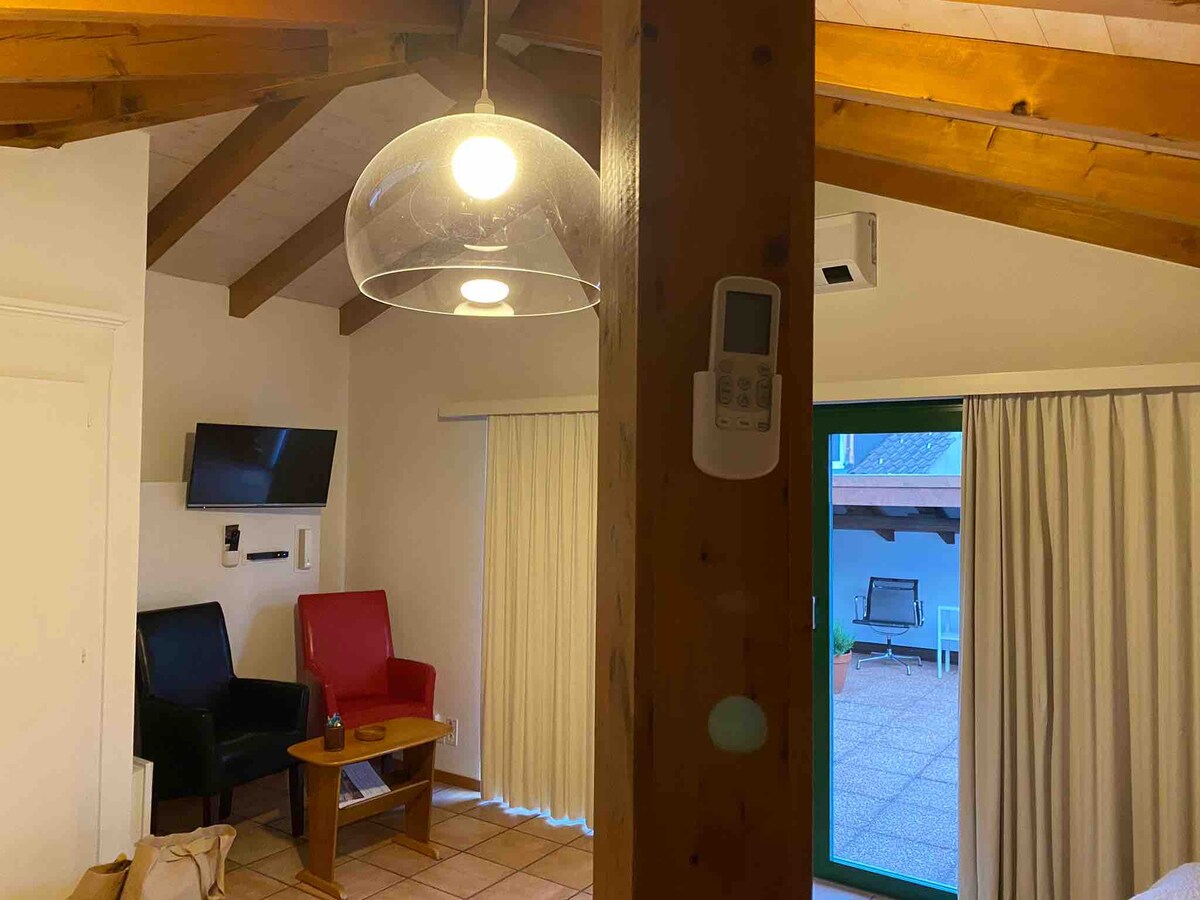 Caratteristica mansarda nel borgo di Ascona ,situata al terzo ed ultimo piano . Ideale per due persone che potranno godersi un'ampissimo terrazzo di 30 m2 Il monolocale è attrezzato con cucina fornita di lavastoviglie ;ampio tavolo, armadio e 2 letti accostati ma separabili Wi fi , televisore lenzuola asciugamani e macchina da lavare ed asciugatrice gratuiti La tassa di soggiorno e’ gia conteggiata nel conto di airbnb