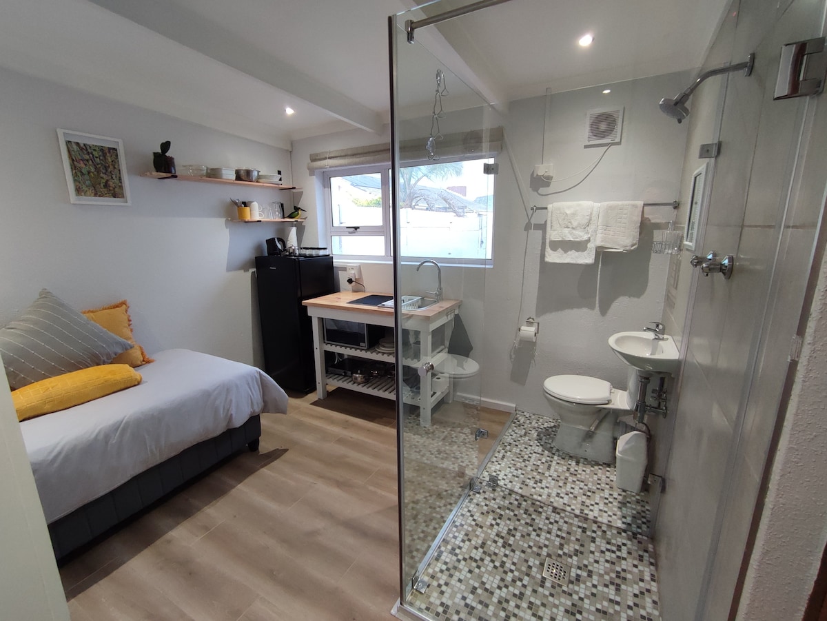 Cet appartement spacieux dispose d'un parking sécurisé fermé pour 1 véhicule de taille moyenne, d'une connexion Wi-Fi, d'un DSTV et d'une entrée privée. Un système solaire et de batterie fournit de l'électricité pendant le délestage. Il se compose d'une chambre lumineuse et aérée, d'une petite cuisine séparée (réfrigérateur, friteuse, micro-ondes, bouilloire, assiettes, tasses et couverts) et d'une salle de bain avec douche. L'appartement est proche de la Panorama Medi-Clinic (2,1 km/5 min), du village de Plattekloof (900 m/3 min) pour vos besoins en matière de shopping, de restaurants et d'une laverie.