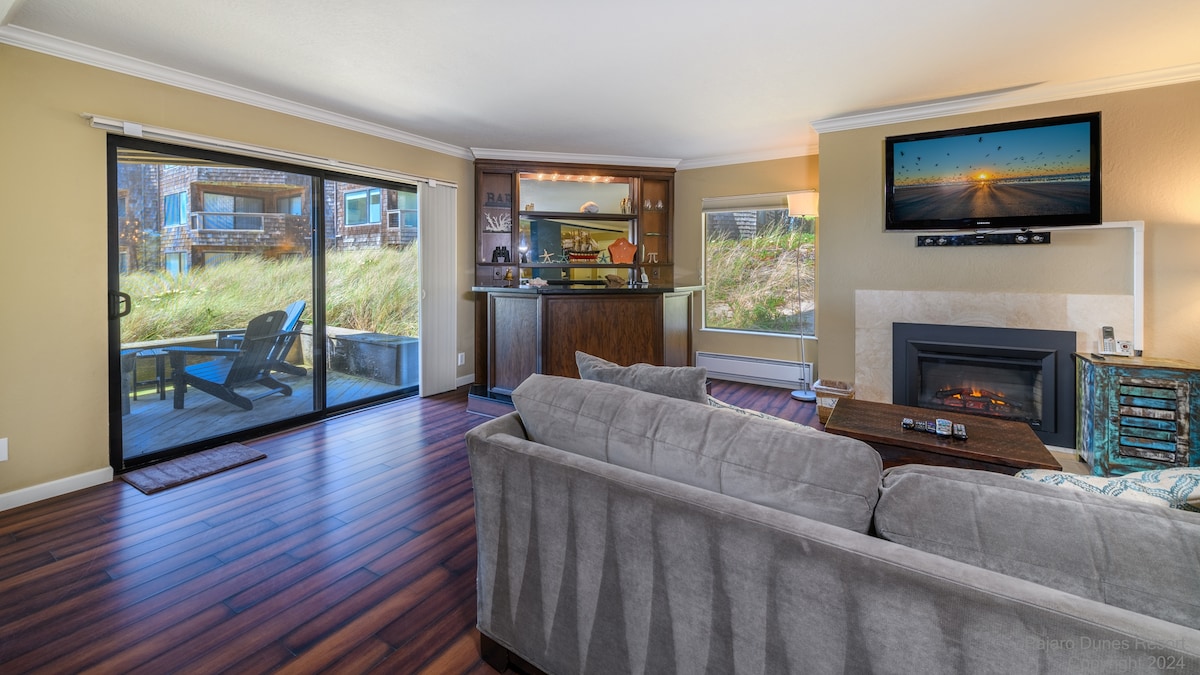 Reposez-vous à terre est l'endroit idéal pour votre escapade de rêve à la plage. Notre condo rénové haut de gamme sur mesure a tout pour plaire: plafonds à poutres apparentes, cheminée, magnifique cuisine et salles de bains, mobilier neuf et cuisine entièrement équipée. Au premier étage (pas d'escalier) et orienté sud pour des journées très chaudes, ce qui le rend parfait pour le barbecue sur le patio ouvert. Prenez quelques pas par la porte d'entrée pour profiter de miles et miles de vue imprenable sur l'océan et la plage. Dormez au bruit doux des vagues d'écrasement.