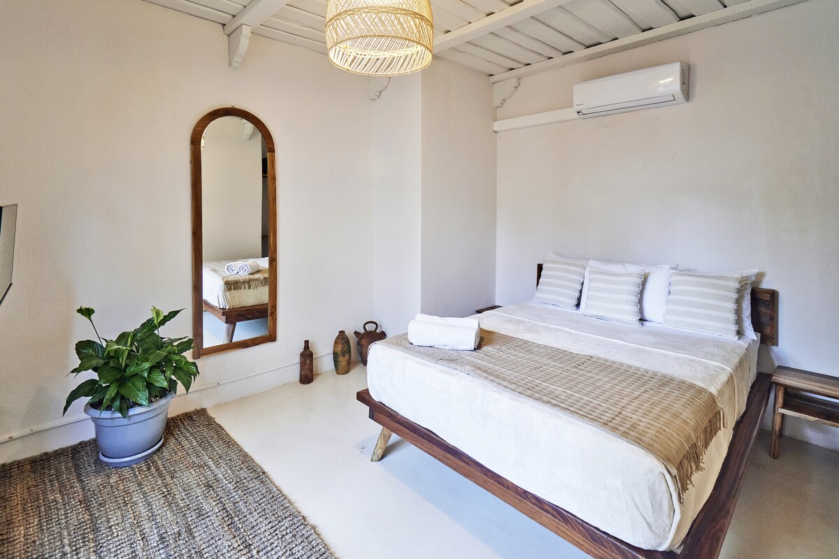 Vous profiterez d'une belle chambre privée avec climatisation, ventilateur au plafond, salle de bain complète avec eau chaude, coffre-fort et Internet. Point Break est situé au cœur de Santa Teresa dans la rue principale, à quelques pas de la plage, du meilleur point de surf de la ville, des restaurants, des magasins et des marchés. Nous proposons une cuisine entièrement équipée, un barbecue, un Rancho avec une table à manger, un coin salon sur le patio et un café gratuit. Vibes décontractées + idéalement situé = Vacances inoubliables !