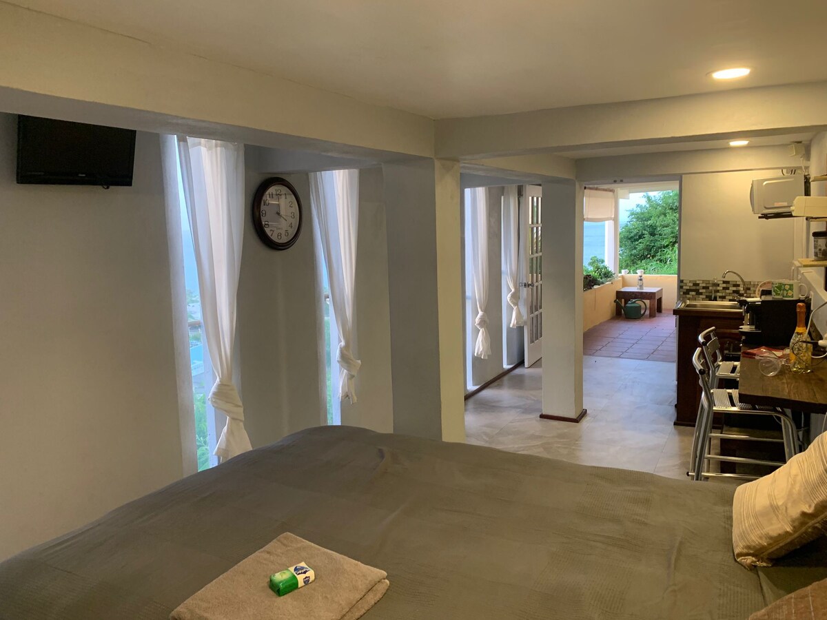 Design écologique avec neuf fenêtres à fente ouverte, espace naturellement ventilé et isolé. Véranda privée avec vue imprenable sur la mer. Construit sur un emplacement à flanc de colline à l'écart de la maison principale, avec un accès privé aux marches, niveau -1 du parking. Il n'est pas rare de repérer l'iguane sur la colline environnante, plantée d'agrumes, de cerisiers, de palmiers, de mangues et d'arbres flamboyants. Petite kitchenette avec : mini-réfrigérateur/congélateur, micro-ondes, bouilloire, grille-pain. Grande salle de bain/salle d'eau carrelée privée avec douche chauffée double