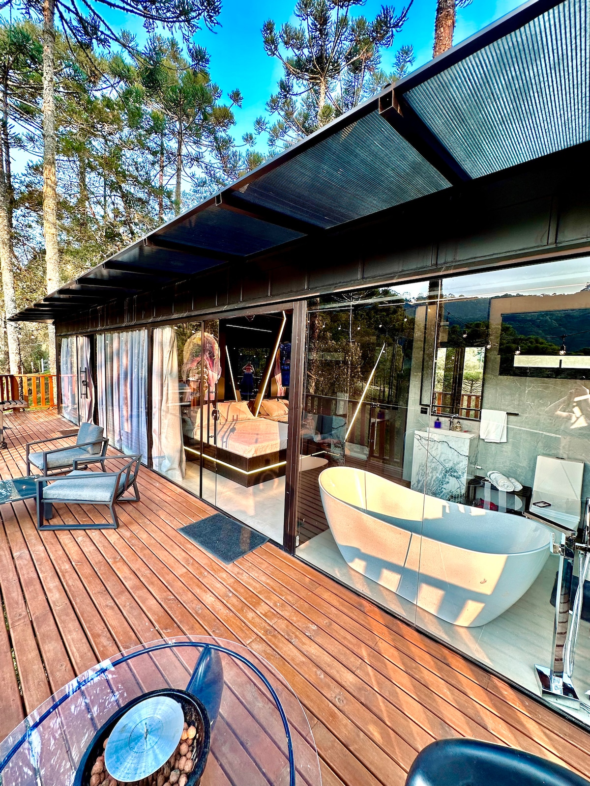 Pousada Morada do Cedro est une retraite luxueuse et moderne située à plus de 1 000 mètres d'altitude, dans les montagnes d'Alfredo Wagner/SC. Avec une architecture élégante en bois et en verre, il offre une suite confortable, un lit haut de gamme, la climatisation et la télévision. La terrasse privée avec vue panoramique rend chaque moment spécial. Idéal pour les couples en quête d'exclusivité, de confort et d'une expérience inoubliable au cœur de la nature.