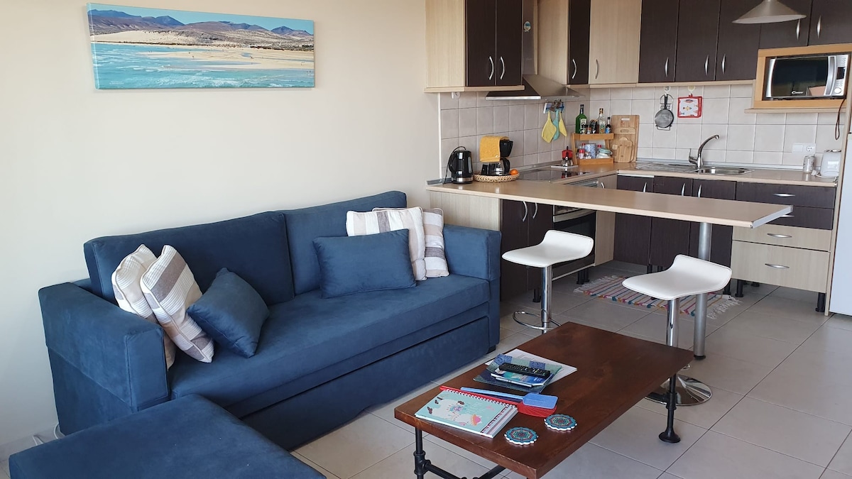 Appartamento ristrutturato composto da camera da letto riservata con Tivù satellitare, bagno, ampio soggiorno completo di Tivù con cucina e divano e terrazzo per colazioni e solarium. L'abitazione è un attico con vista meravigliosa sull'oceano e sulla splendida spiaggia Jandia.