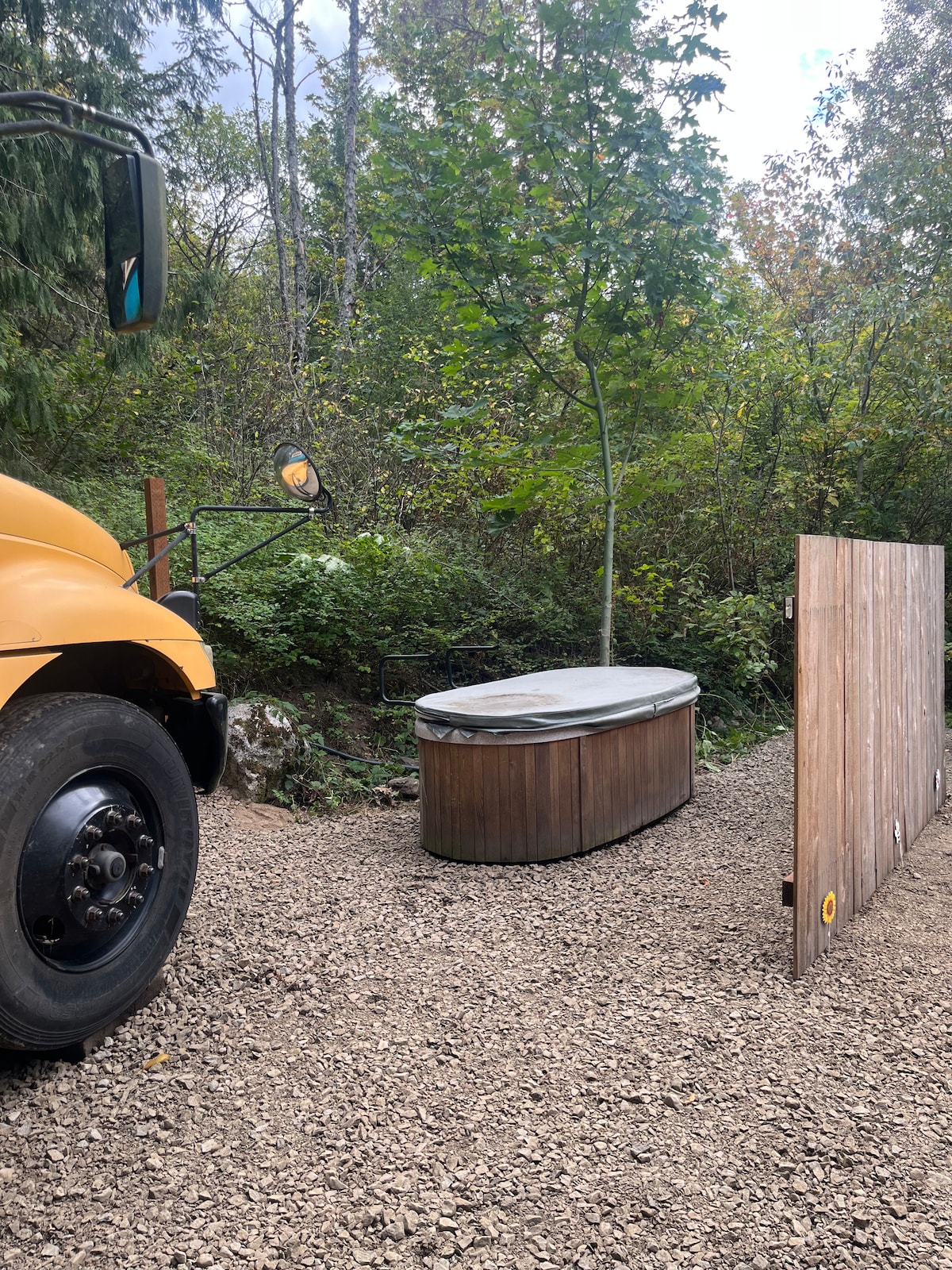 Venez visiter le RMR et profiter du skoolie que nous appelons le Bee Haven Bus. Profitez des sons de la ferme tout en profitant d'un feu de camp chaleureux. Vous aurez une vue directe sur la forêt, les émeus, les chèvres et la volaille. Lorsque vous êtes prêt à vous retirer pour la nuit, montez dans le bus entièrement équipé. Il y a un évier, une cuisinière à propane à 2 feux, un four grille-pain, un petit réfrigérateur, une baignoire rustique avec douche, un chauffe-eau instantané, un lit Queen Size, un siège de bus d'origine avec un bureau rabattable pour un ordinateur portable et une chaise longue hamac.