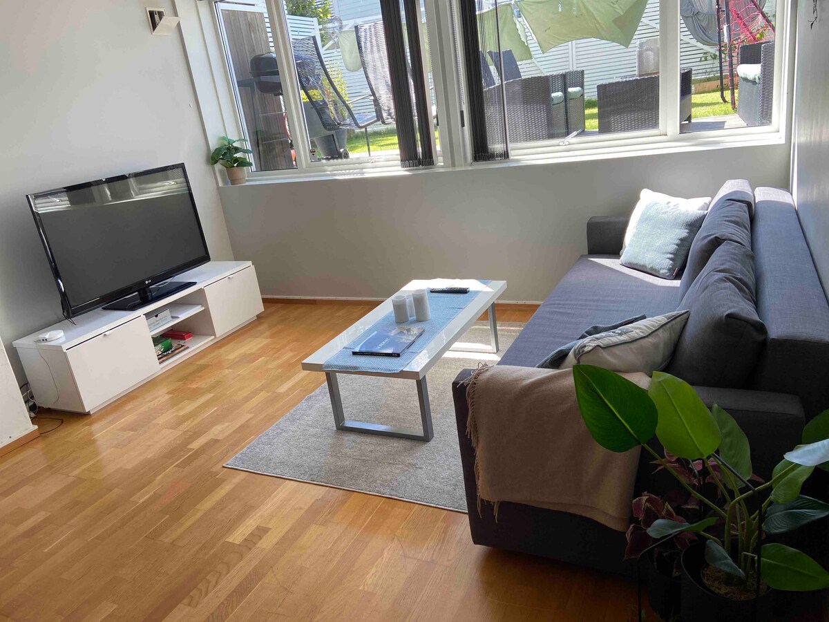 Mon logement est proche du centre-ville, des transports en commun, des parcs et de la vie en plein air. Le logement est parfait pour une personne, mais peut accueillir 2 personnes. Il coûte 200 kr de plus par nuit si vous êtes deux. Lit(90 cm+matelas au sol) Il est possible de cuisiner des aliments simples. Plaque chauffante, micro-ondes ++ NB ! La kitchenette et la salle de bain/WC sont dans la même pièce. Un salon avec un lit de 90 cm. Si 2 voyageurs, matelas supplémentaire. L'appartement est au sous-sol. Hauteur de plafond d'environ 97 cm. Le linge de lit et les serviettes sont inclus. Parking gratuit dans la rue.