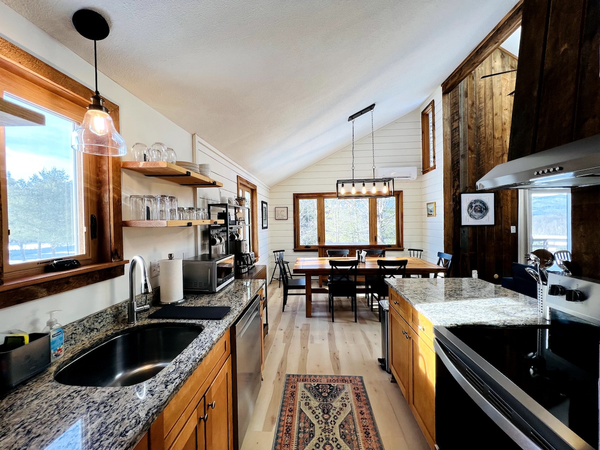 Escape to a peaceful, lakeside retreat with a secluded sun-lit deck and private dock with incredible views of Sunrise Lake, plus a 4-person hot tub, and seasonal amenities like a pedal boat, two kayaks, a SUP board, gas fire table, central A/C, a pellet stove, and snowshoes. Enjoy nearby activities like hiking, leaf peeping, skiing, and visiting scenic towns, local vineyards and breweries — or simply relaxing in a beautiful lakefront setting. The sunsets can be unbelievable!