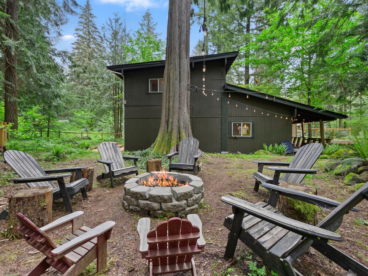 Cabane confortable en cèdre Wy'east + jacuzzi + brasero + poêle à bois