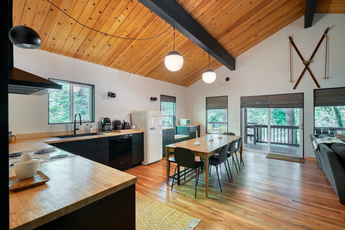 C'est le « camp de base » idéal pour échapper à la foule après une journée bien remplie sur les pistes ou les sentiers de randonnée. La magie de cet endroit est la transition facile de la cabane de ski au refuge d'été. L'immense cour clôturée est sous la canopée de la forêt de pins imposants et de fougères luxuriantes, offrant des endroits frais pour faire une sieste dans le hamac, lire dans les chaises Adirondack, jouer à des jeux de jardin et se détendre autour d'un feu. Apportez de la nourriture pour le barbecue et profitez de l'air frais des montagnes.
