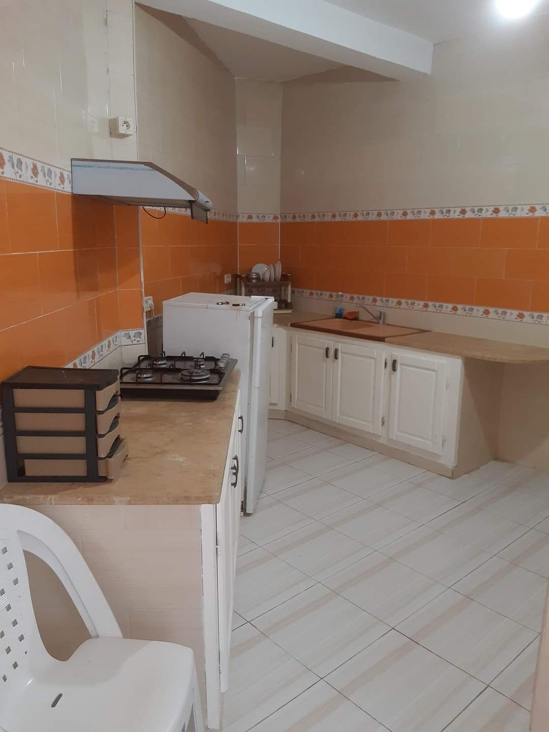 Dans le quartier de Mtorrech, sejournez dans ce bel appartement climatisé dans le salon au premier étage d’un petit immeuble privatif. Vous y trouverez un grand salon traditionnel, une cuisine équipée une salle d’eau -wc et deux chambres avec chacune deux lits. Cet appartement de 110 m2 situé à 1 kilomètre de la mer et proche des commodités vous garantit un séjour paisible pour votre voyage à Gabes. Nous seront ravis de vous accueillir dans ce lieu propre (merci de le rendre à l’identique)