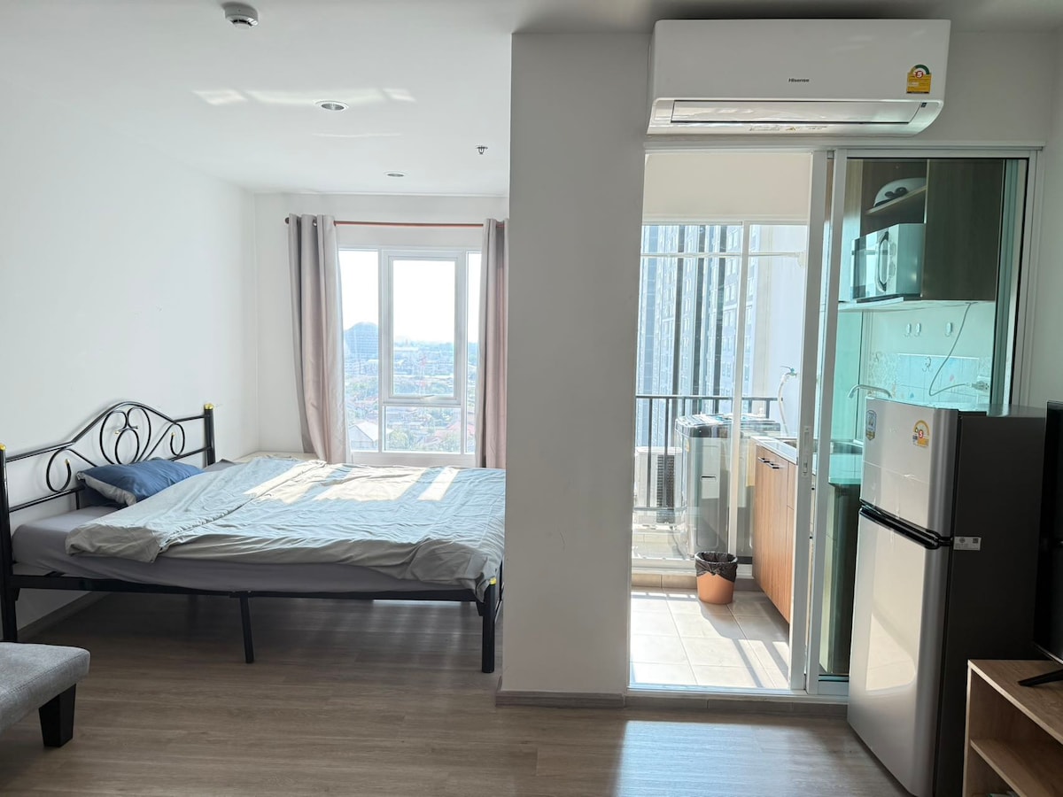 Découvrez une oasis urbaine élégante dans notre appartement du 25e étage à Parkland Ngamwongwan. Profitez de la lumière du soleil douce et de la vue sur la ville tout en profitant de la proximité du MRT, des commerces et des hôpitaux. Offrez-vous des équipements de luxe : piscine d'eau salée, centre de remise en forme, jardin, sécurité et parking 24h/24 et 7j/7. Notre havre de paix confortable de 31 m ² dispose d'une cuisine entièrement équipée et d'une salle de bains privative. Moderne et bien meublé, il est parfait pour un séjour sans effort. Vivez une commodité et un confort inégalés dans cette retraite chic de la ville. Réservez dès aujourd'hui !