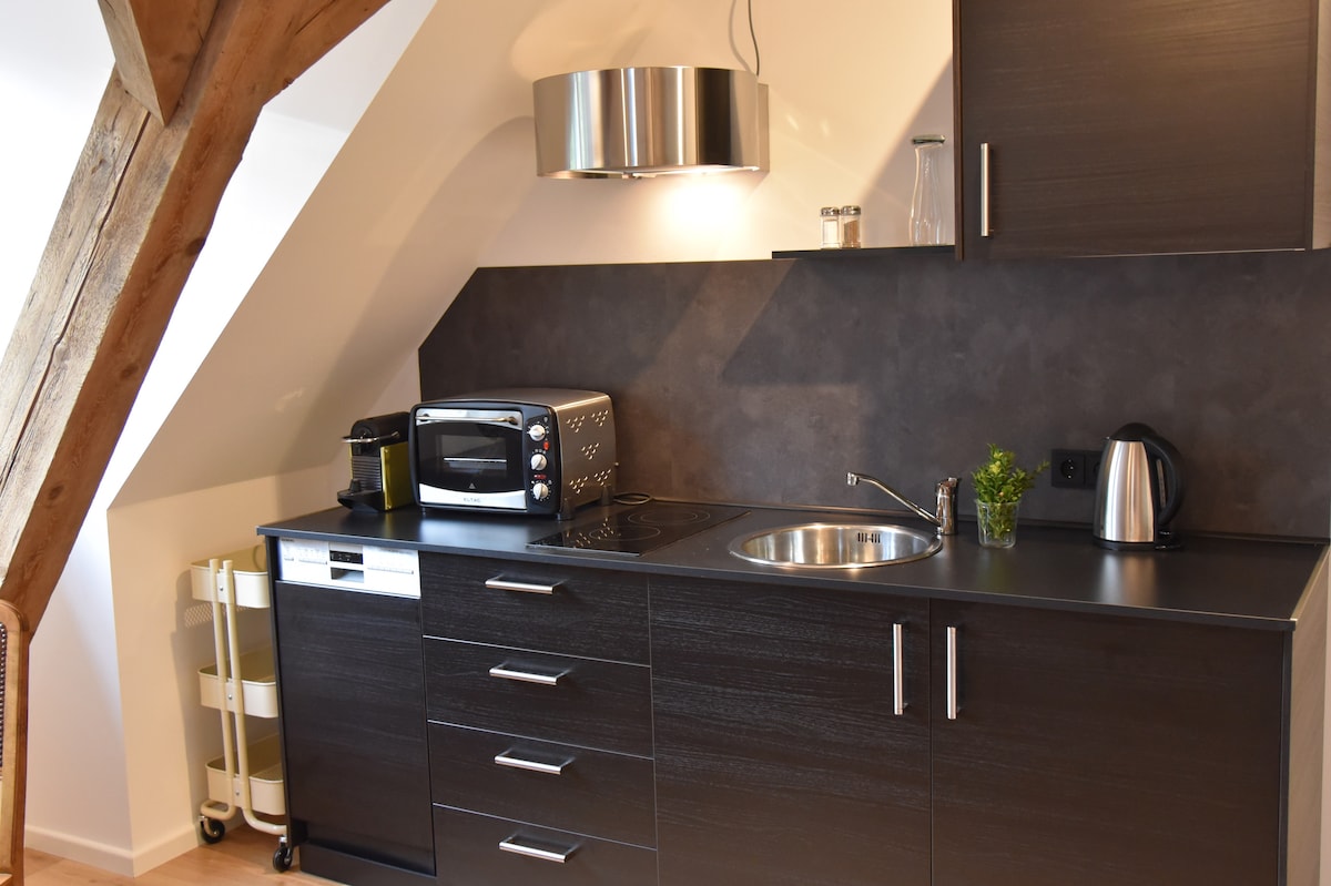 Vivre dans une maison Gründerzeit : unique, confortable et un peu plus belle ! L'appartement loft moderne est situé dans une belle maison Gründerzeit située dans le centre-ville de Hof. La zone piétonne et la gare sont chacune à seulement quelques minutes à pied. Le loft dispose d'une kitchenette, d'un lit queen, d'une salle de bain attenante avec baignoire indépendante ainsi qu'une douche au sol. Les projecteurs de plafond peuvent être ajustés en couleur pour créer une ambiance individuellement confortable pour le bain.