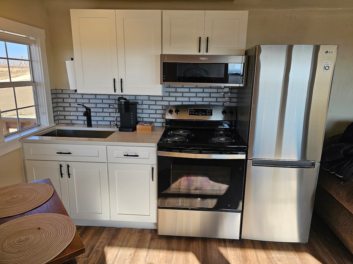 Le Barnhouse est une escapade Western-chic pour deux : un séjour élégant et confortable juste à l'extérieur de Boise. À l'intérieur, installez-vous confortablement près de la cheminée à granulés et enfoncez-vous dans des fauteuils inclinables en cuir, pour vous mettre dans l'ambiance. À l'étage, un lit queen-size et un demi-bain légèrement éclairés offrent intimité et repos Savourez un café à la fenêtre de la cuisine : parfois, des agneaux paissent à l'extérieur. Conçu pour deux et proche de Boise, The Barnhouse allie confort, style et charme : le calme de la campagne sans la longue route qui mène nulle part.