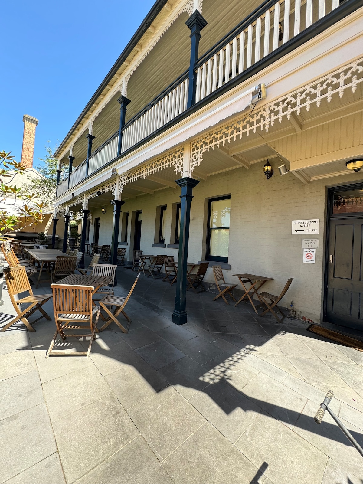 This room is a family room with 1 queen bed and 2 single beds. Recently renovated this is a generous sized room, which is light and bright and perfect to help with a good night sleep. With access to the outside balcony, enjoy a coffee or glass of wine while watching the world go by. All rooms have shared bathroom facilities which have been beautifully renovated.