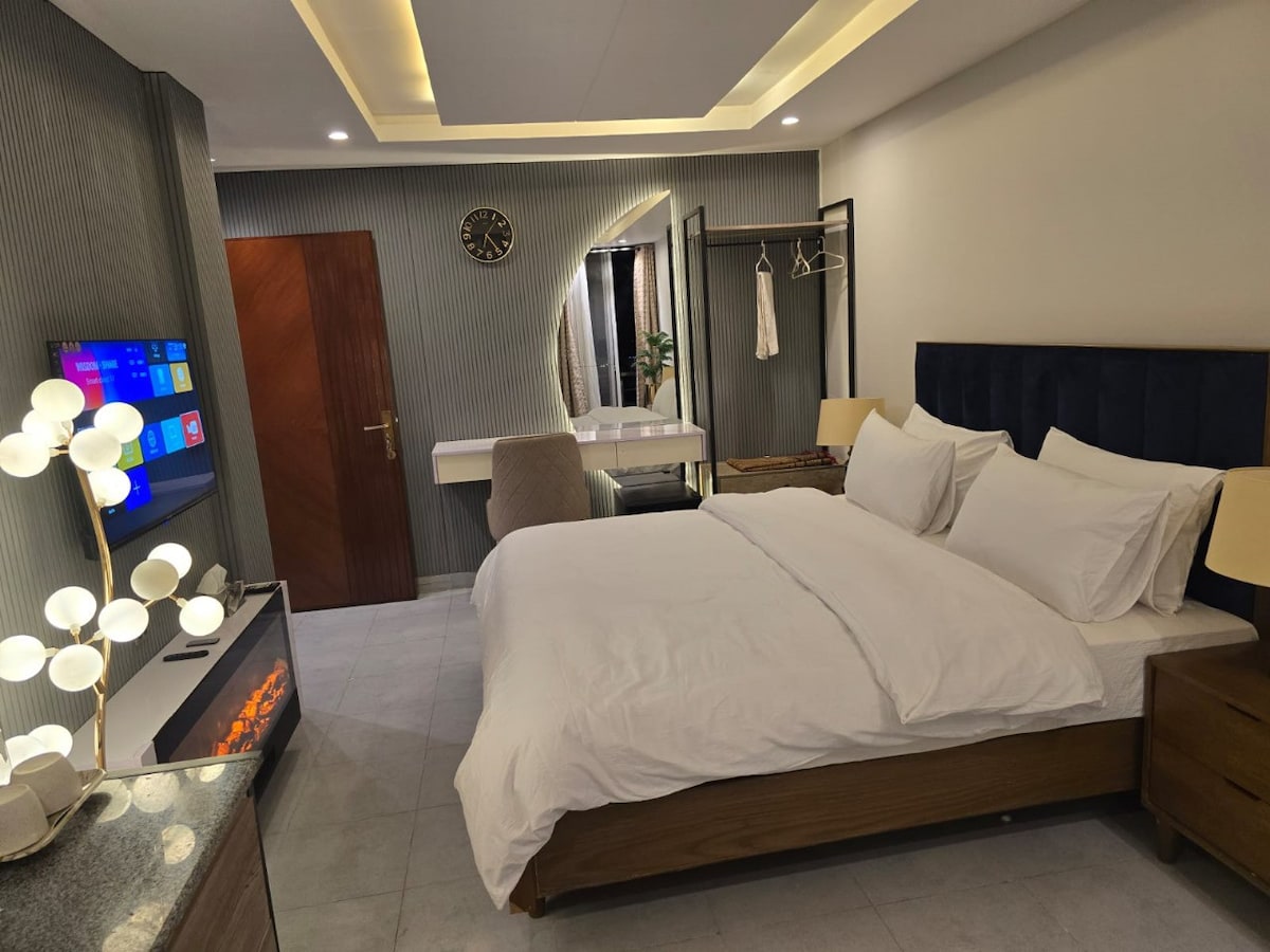 Détendez-vous dans notre élégant appartement d'une chambre à Murree, avec une vue imprenable sur la vallée depuis un balcon privé. Idéal pour les couples ou les voyageurs en solo, l'espace comprend une chambre confortable, une salle de bain moderne, un salon, une cuisine équipée et une connexion Wi-Fi rapide. Situé à quelques minutes de Mall Road dans un cadre paisible, c'est la retraite parfaite dans les collines. Profitez de l'électricité 24h/24 et 7j/7, de l'eau, d'un parking sécurisé et d'un service de conciergerie dédié pour un séjour sans accroc.