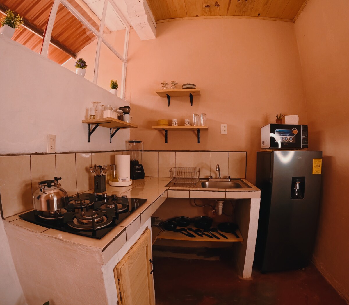 Cette cabane confortable a été faite avec beaucoup d'amour. C'est un espace d'environ 16 mètres carrés plus le loft pour dormir. Il dispose d'une petite cuisine, salle de bain, internet fibre optique, rocket mass heater, etc. La cabane est à côté de ma maison, à trois mètres de ma cuisine ; si vous avez besoin de quelque chose, nous sommes à proximité, mais elle a une entrée indépendante. Le chalet est fait d'adobe.
