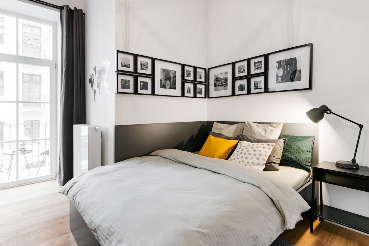 Un antidote aux chambres d'hôtel fades :) Mon appartement est situé au premier étage d'un immeuble historique et ses caractéristiques d'origine, comme les hauts plafonds et les parquets, conservent la grandeur des résidences de Prague du début du XXe siècle. Caractéristiques : - cuisine (et Nespresso) ; - baignoire, douche, lave-linge, lit 200X160cm. Le quartier conserve son charme « local », le voyage vers le centre est facile et il y a un magasin vietnamien cool à côté.