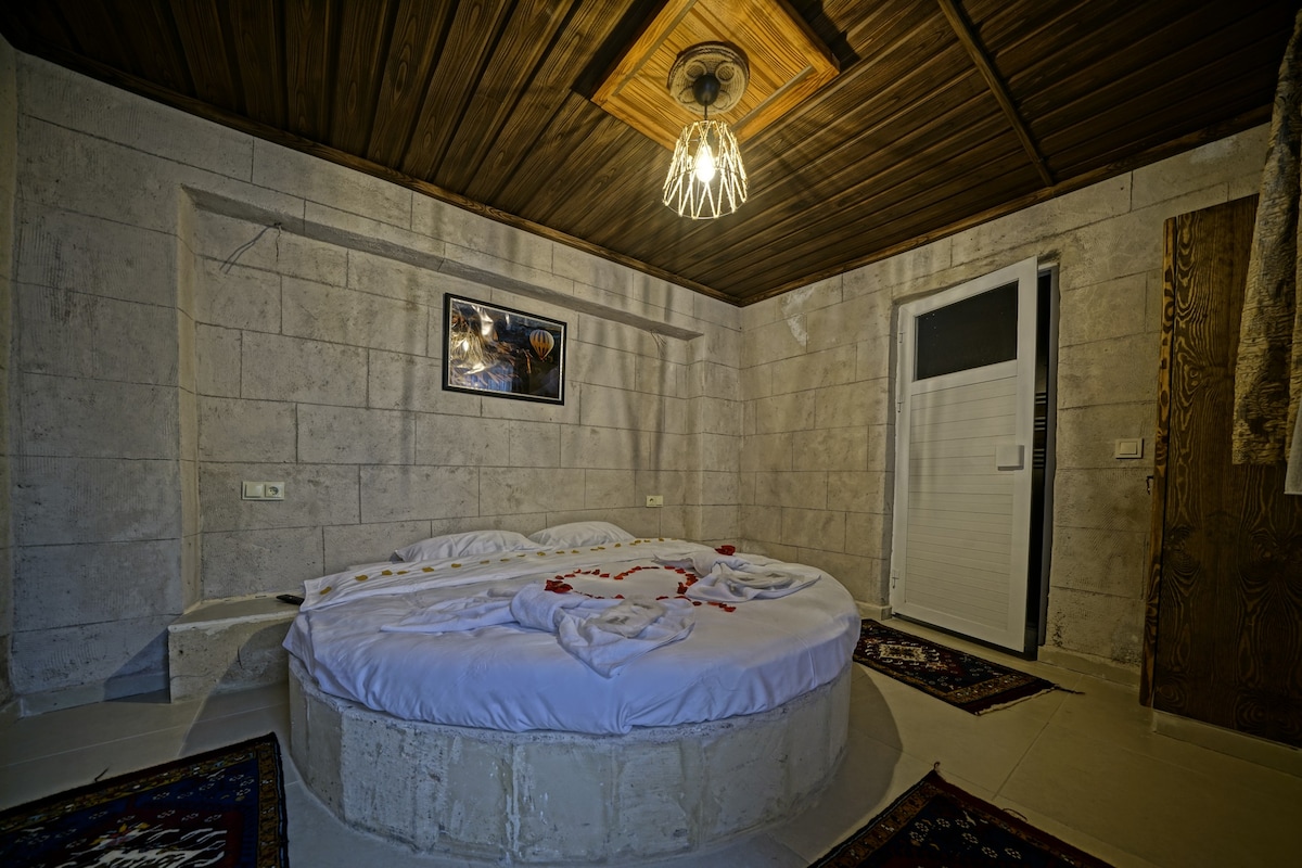 Vivez une escapade paisible dans un village de Cappadoce à Eka Cave Maison. Cette suite Deluxe avec jacuzzi privé offre un lit mural sans pieds, cheminée cosy et décor en pierre authentique. Profitez de la vie locale du village, d’un cadre serein et d’un séjour luxueux et intime. Petit-déjeuner avec produits locaux inclus.