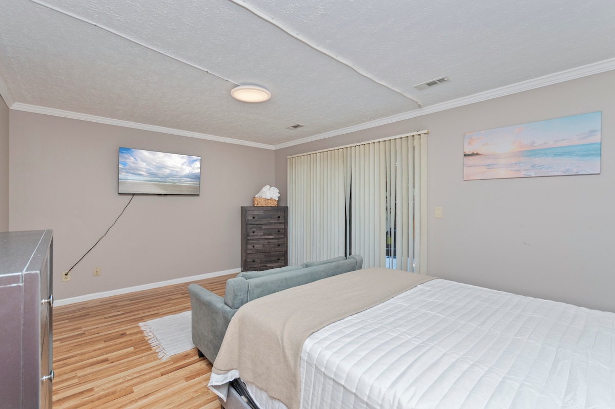 Our condo is located in the front section of the "A"Bldg.This condo has a KING bed in the master with a full sized private bathroom, twin beds in the 2nd bedroom and a queen sofa bed in the living room. There's also another full bathroom . We are located in a 33 acre ocean front resort with 6 pools on the border of Surfside at the southern end of Myrtle Beach,.We also have 24 hour security for our guests. Our resort is a very family oriented resort. Lazy river,heated pool.Outdoor games!