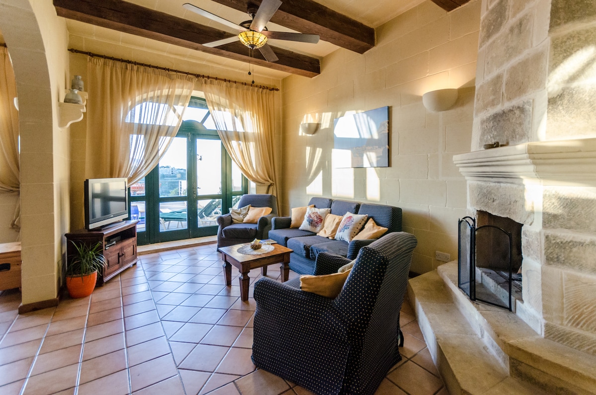 Belle et spacieuse ferme traditionnelle de 500 ans du Gozitan. La maison est composée de 3 chambres, chacune avec une salle de bains privative et des balcons donnant sur la mer et les îles de Comino et Malte. Vue sur la mer depuis votre lit, salle de bains privée, climatisation en été et système de chauffage les jours d'hiver. salons spacieux - salle à manger, cuisine et un espace extérieur avec barbecue. La ferme dispose d'une belle piscine et de chaises longues pour profiter du soleil.
