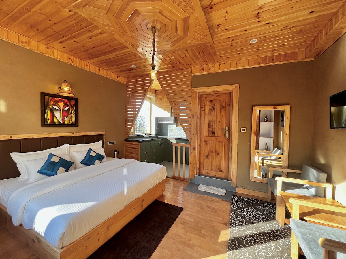 Partez pour des vacances paresseuses et lentes dans notre chalet unique et isolé. Notre chalet est construit à Kathkuni, fait à l'aide de bois recyclé et de pierres naturelles de 18 pouces qui maintient la pièce isolée à tout moment, il dispose également d'intérieurs de boue rustique qui ajoute à l'isolation. Il y a un magnifique balcon très spacieux et nous sommes sûrs que vous allez y passer la plupart de votre temps. Nous avons également une cuisine expérimentale dans notre propriété où nous préparons des plats multi-cuisins fraîchement sur commande.