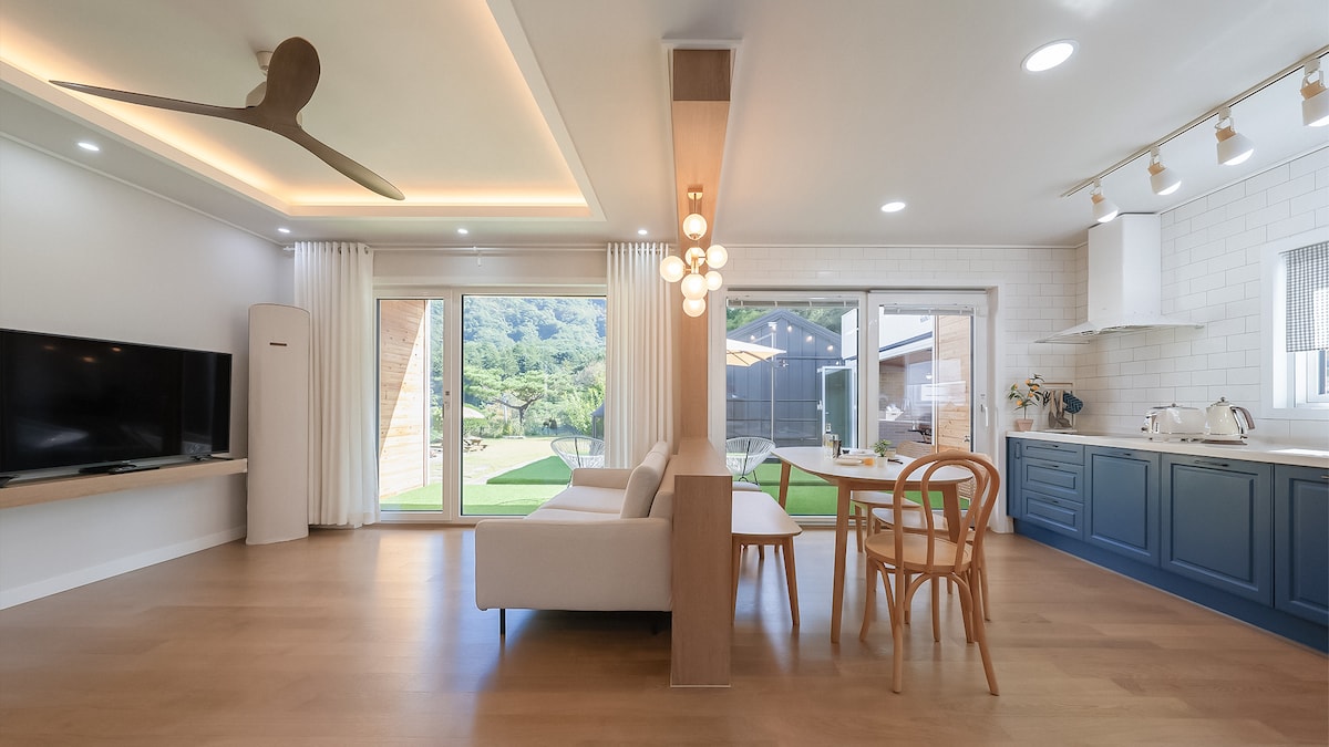 Chuncheon Sky Mung Stay est un bon endroit pour faire du vélo le long de la rivière, se promener, profiter du paysage et se ressourcer car il est adjacent à la tour Gyeongchulchong sur la piste cyclable de Jiameungso (Spring Trail 4 Course). * Caractéristiques : un hanok moderne où vous pourrez vous détendre en privé. Hébergement privé. * Emplacement : à environ 10-15 minutes en taxi de la gare de Chuncheon. * Équipements : la nouvelle succursale Maejji de Seochuncheon Hanaro Mart est à seulement 1 minute, il est donc très pratique pour faire du shopping. * Barbecue : un gril électrique sur pied (à l'intérieur du café de l'entrepôt) ou un barbecue extérieur peuvent être loués gratuitement. * Préparation : le charbon de bois et le treillis métallique ne sont pas fournis, et vous devez les acheter directement chez Hanaro Mart de l'autre côté de la rue. * Karaoké : disponible jusqu'à 20h pour éviter les plaintes liées au bruit. * 2 vélos. Pompe à vélo. Usage personnel. * Service : service de café en capsule et de nouilles en tasse. * Attention : la rivière est proche, il y a donc beaucoup d'insectes en été. Il est recommandé de fermer la porte lorsque vous entrez et sortez, et de baisser les stores ou d'éteindre les lumières le soir.