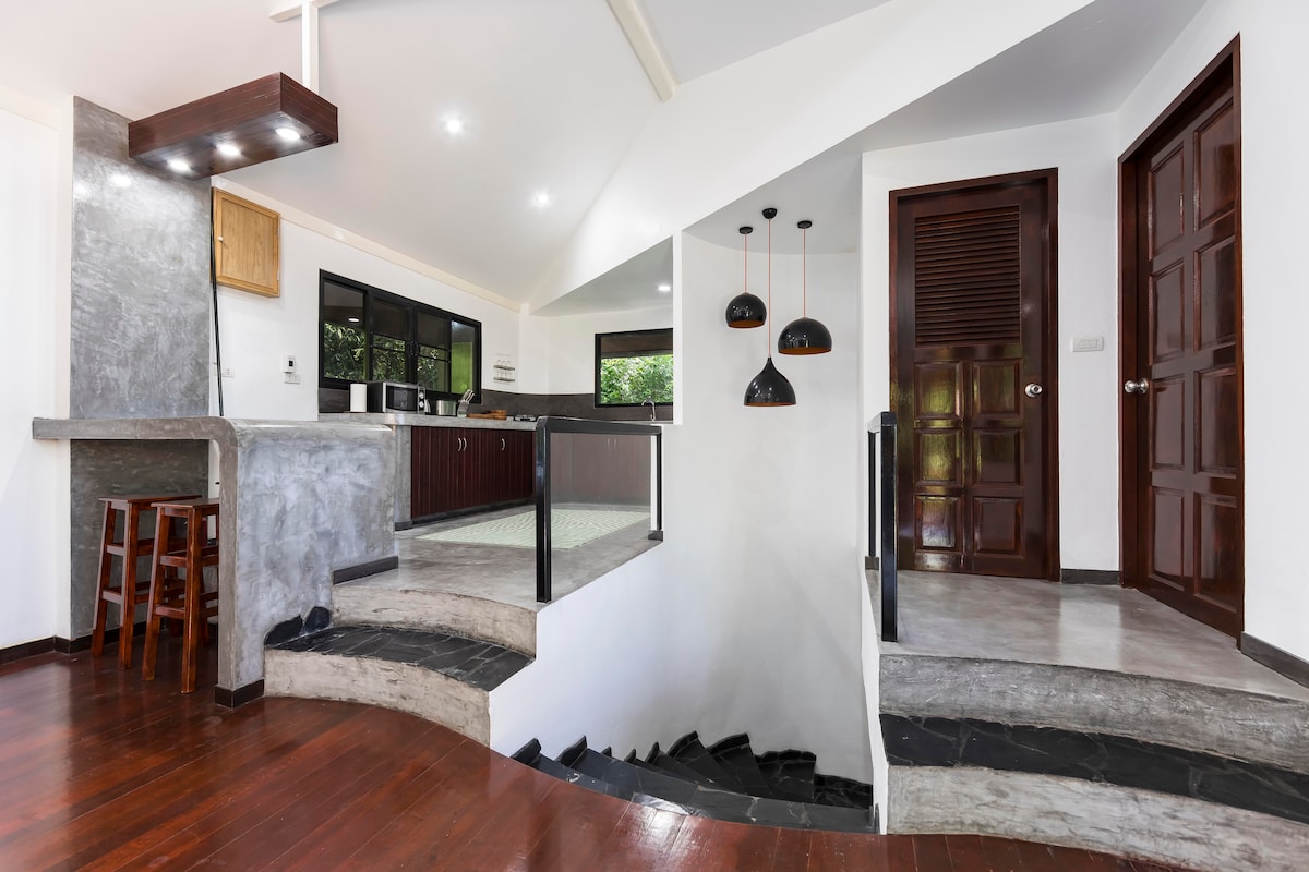 Détendez-vous dans ce logement calme, intime et élégant. Le salon ouvert est décoré avec goût avec des meubles traditionnels thaïlandais et dispose d'une cuisine entièrement équipée, d'un salon confortable et d'un coin repas. Les portes s'ouvrent sur une spacieuse terrasse extérieure, avec une piscine privée, un salon et un coin lit de jour, l'endroit idéal pour se détendre. Nichée à flanc de colline au milieu d'une jungle tropicale luxuriante, la maison offre une intimité ultime, de magnifiques couchers de soleil et vue sur la mer. (Âge minimum : 12 ans)