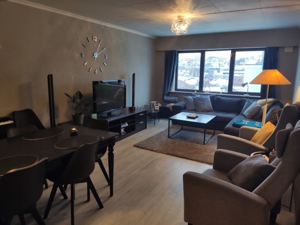 Appartement en centre-ville à Narvik avec vue imprenable sur la mer et Narvikfjellet. L'appartement est situé au 2e étage avec couloir, salon, cuisine, 2 chambres, 2 balcons, salle de bain avec baignoire. Salle de sport, lave-linge, sauna et douche au sous-sol. L'appartement est dans un quartier calme, à 10 min à pied à distance du centre-ville de Narvik. Le lieu Dans une chambre, il y a un lit double de 180, sur les 2 autres lits simples. 1 parking sur le terrain, possibilité de 2 « à convenir à l'avance ».