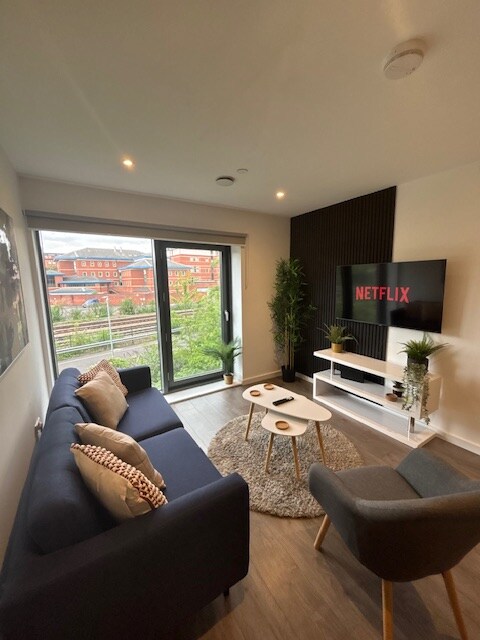 Appartement lumineux et spacieux récemment rénové au cœur du centre-ville, donnant sur un jardin verdoyant. Une cuisine bien équipée, qui comprend tous les éléments essentiels dont nous pensons que vous avez besoin, tels qu'une cafetière, des meubles de qualité et une connexion Wi-Fi haut débit à fibre optique ultra-rapide. Il y a également une salle de restauration pratique Tesco 's et M&S le long de la route pour l'épicerie. La gare de Nottingham et le Motorpoint Areana sont à moins de 10 minutes à pied. L'appartement est pour 4 personnes, avec un canapé-lit pour une 5e personne.