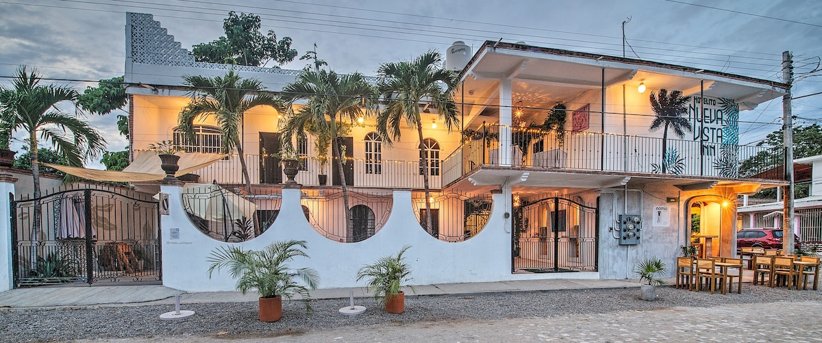 Profitez de notre confortable maison de plage avec vue à 360°. Chaque chambre dispose d'une salle de bains privative et d'un grand balcon privé où vous pourrez admirer le magnifique lever et coucher du soleil. Mini-réfrigérateur et eau chaude/froide inclus. Les espaces communs comprennent une terrasse sur le toit et une piscine avec un espace salon. Nous sommes à seulement quelques pas de Playa Hermosa, une plage vierge. Super plage pour le surf et la baignade. Près de Playa Borrego avec de superbes ramadas à proximité pour prendre un délicieux repas ou une noix de coco fraîche. Adultes uniquement et 420 amical.
