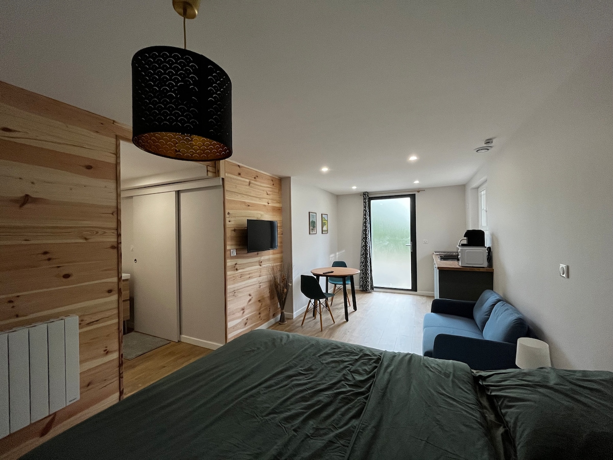 Au coeur des volcans d'Auvergne, petite maison dans un écrin de verdure ; 30 mètres carrés avec : - cuisine équipée - salle d'eau spacieuse avec linge de toilette inclus - salon équipé avec canapé convertible A l'étage, mezzanine : - lit double - petit bureau - placards A l'extérieur : - place de parking - terrasse équipée Nous recevons pour la nuit, la semaine ou encore le mois. La maisonnette se trouve dans la cour de notre propriété à Rouillas-Bas sur la commune d'Aydat.
