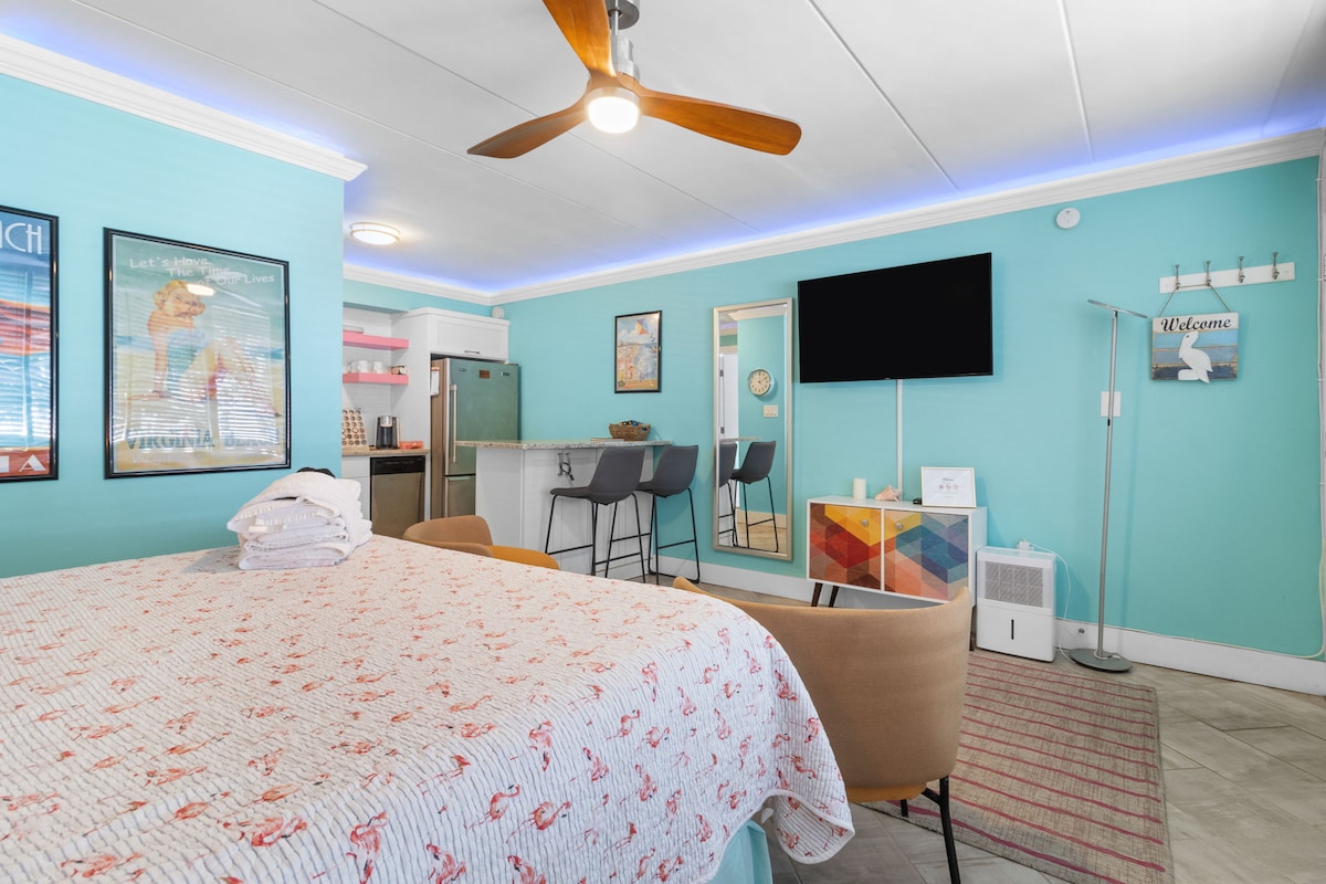 Appartement d'une chambre (en annexe) récemment rénové, super propre, d'environ 375 pieds carrés. À trois pâtés de maisons de la plage 7-10 min à pied. Terrasse couverte, jardin sur l'eau pour observer les canards, les hérons, les poissons. Bancs en béton et foyer près de l'eau. À distance de marche de l'océan, de la promenade, de Rudee Inlet, des restaurants et des divertissements. Plancher de bois franc, lit queen size, « parc pour bébé », kitchenette avec évier, réfrigérateur, micro-ondes, cafetière Keurig, grille-pain (pas de four ni de cuisinière) 1 gig mbps Wifi, télévision par Internet. Canapé de type futon.