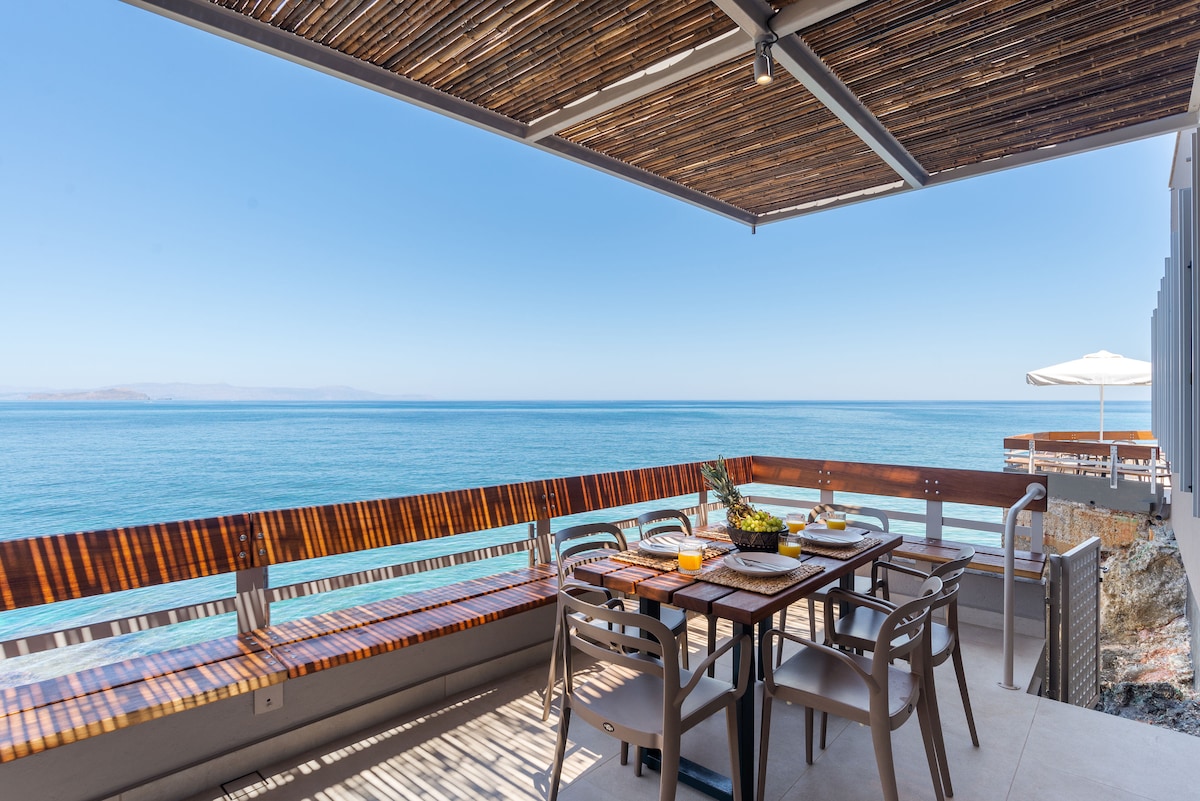 La Villa Hydrobates en bord de mer se dresse fièrement sur les rochers et se caractérise par une esthétique élevée avec une vue panoramique imprenable sur la mer de Crète. Elle dispose d'un jacuzzi extérieur avec possibilité de chauffage et est entièrement équipée, offrant aux clients un séjour confortable et relaxant. Le jacuzzi chauffé est facturé 40 euros/nuit en supplément et nécessite un préavis de 2 jours.