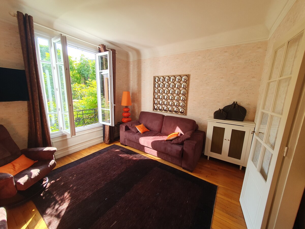 Charmant appartement indépendant bercé par les arbres & fleurs du jardin. Situé dans un quartier paisible, le logement est à 5min à pieds d’un grand parc arboré. Il est aussi proche de nombreux sites des Jeux Olympiques 2024: - 10km de la base nautique de Vaires sur Marne - 11km de Paris (RER A & E) Disneyland Paris est aussi très proche et accessible en RER A. Le logement dispose d’une chambre séparée avec un grand lit de 160cm et d’un canapé convertible 2 places avec un couchage agréable.