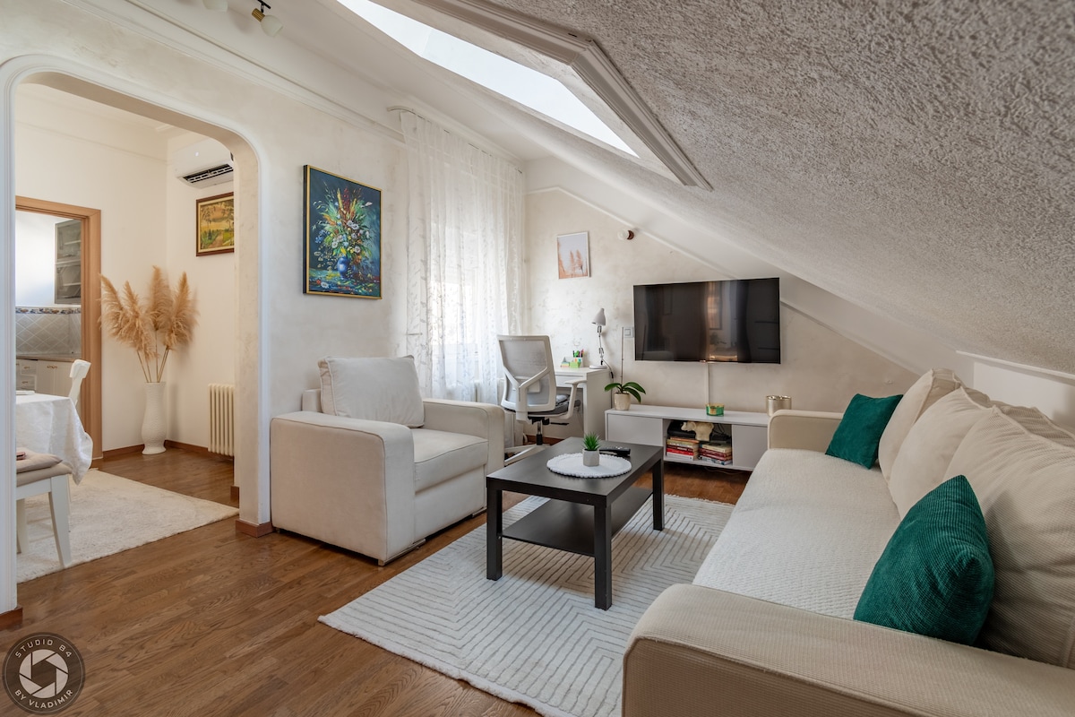 Cet appartement de 80 mètres carrés dispose de deux chambres divisées par une grande cuisine/salle à manger/salon. L'appartement est situé à distance de marche des principaux sites touristiques de Belgrade – Assemblée nationale, musée et théâtre, rue Knez Mihajlova, forteresse de Kalemegdan, Skadarlija (le quartier bohème). Les voyageurs peuvent trouver diverses options de nourriture et de boissons dans les restaurants, cafés et pubs à proximité. Certains des restaurants les mieux notés se trouvent dans cette région. Il y a une épicerie 24h/24 et 7j/7 au coin.
