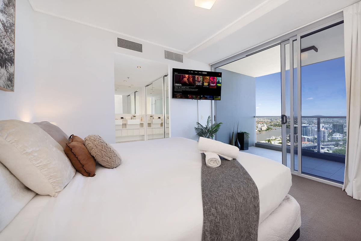 Situé tout en haut, au-dessus du 30e étage, avec 3 chambres et 3 balcons offrant une vue spectaculaire sur le Story Bridge, le fleuve Brisbane et le Fortitude Valley (parking inclus). 2 climatiseurs neufs en 2026 ! Profitez de l'incroyable vue sur le balcon, aventurez-vous dans la ville de Brisbane avec tout ce dont vous avez besoin à moins de 10 minutes à pied, y compris des restaurants, des supermarchés, des cafés, des bars, des lumières de nuit et la ville. Profitez d'une expérience élégante dans cet appartement indépendant situé au centre de Brisbane City, avec cuisine complète.