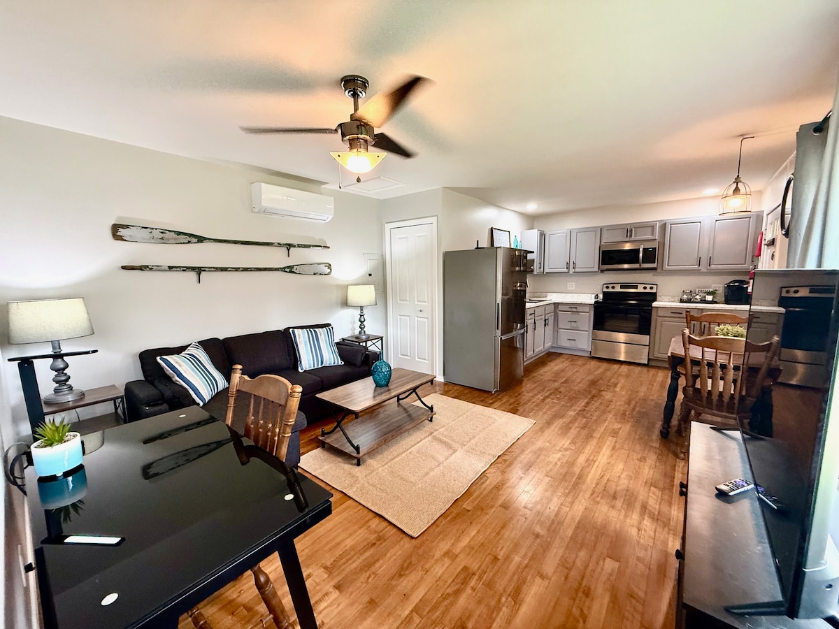 Très supérieur aux chambres d'hôtel de la région, cet appartement HAUT DE GAMME d'une chambre est équipé d'une CONNEXION WI-FI GRATUITE, de télévisions ROKU de 50" et 32" (utilisez vos applications préférées), de la télévision par câble via l'application Spectrum, d'un lecteur DVD/CD/Blue Ray, d'un bidet, d'un lave-linge/sèche-linge, d'un jacuzzi, d'une cuisine équipée. Chambre avec le meilleur lit King Size de tous les temps, armoire/placard, commode, tables de nuit, salle de bain et salon avec canapé-lit Queen Size facile à utiliser. Gaz, électricité, eau, déneigement, parking, plancher en bois franc, cuisine et salle de bain carrelées. D'ÉNORMES RÉDUCTIONS POUR LES SÉJOURS LONGUE DURÉE !