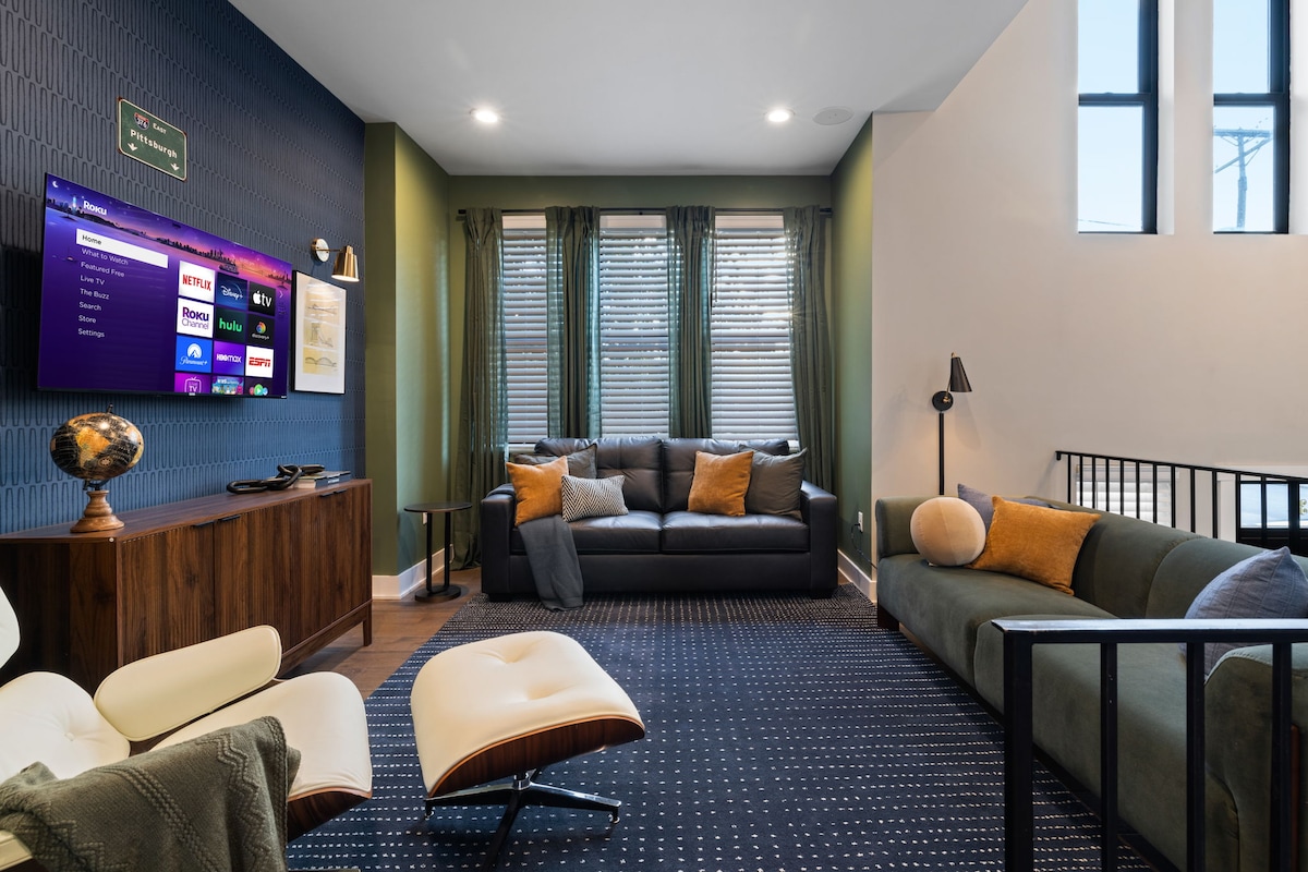 Entrez dans notre maison en rangée de vibrations industrielles et sentez-vous comme chez vous ! Les hauts plafonds, la décoration bien pensée et plus encore font de ce charmeur de Lawrenceville un endroit idéal pour vous et vos amis ou votre famille. Décorée par un designer local, chaque chambre a un « thème » ludique et de bon goût : Art déco, Pittsburgh, Tiki et Warhol. Notre cuisine bien approvisionnée vous invite à séjourner et cuisiner un repas, mais notre emplacement vous encourage à vous diriger « aht » sur le « tahn » pour la nourriture et les boissons. Au plaisir de vous accueillir !