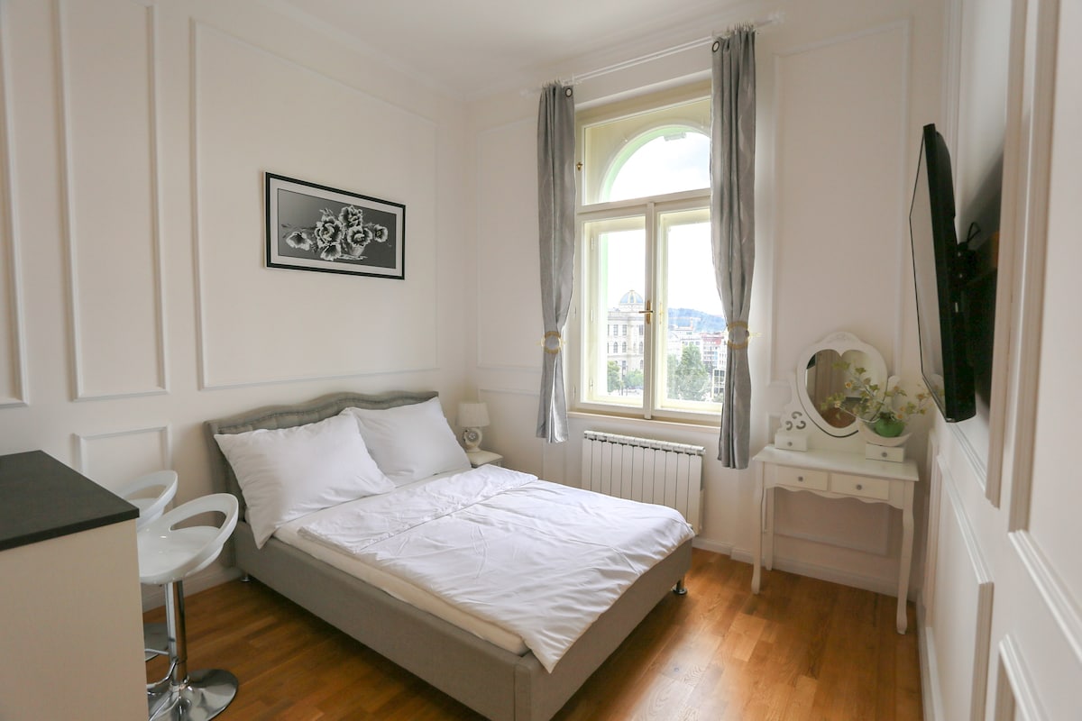 Appartement confortable 30 m2 ★ Terrasse ★ Climatisation Centre ★ Ville ★ Facilement Accessible ★ Rénové ★ Grande Lokation ★ Situé dans une cour calme située dans le bâtiment historique de la Neo- Style Renaissance. ★ L'emplacement se situe à 5 minutes de la place Venceslas et du musée national. ★ Lit double à sommier confortable avec matelas de qualité ★ Cuisine équipée Machine à café★ Nespresso ★ Salle de bain avec serviettes, gel douche