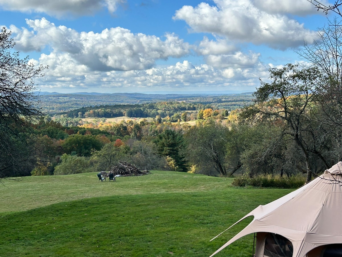 Au bord d'une prairie de fleurs sauvages avec vue sur la montagne, cette tente de glamping joliment meublée dispose de deux lits Queen Size, d'un porche avant et d'une terrasse arrière privée. Chacune de nos quatre tentes dispose d'une kitchenette dans le chalet. Nouveau bain public. Profitez de la pizza au feu de bois (la plupart des nuits, mais pas toutes) et de notre nouveau jacuzzi en bois naturel (réservé pour une expérience privée pour 25 $). 40 acres de prairies, de bois, d'étang, de ruisseaux et de sentiers. Feux de joie nocturnes et observation des étoiles, un lac à proximité et rafting dans la rivière Hudson.