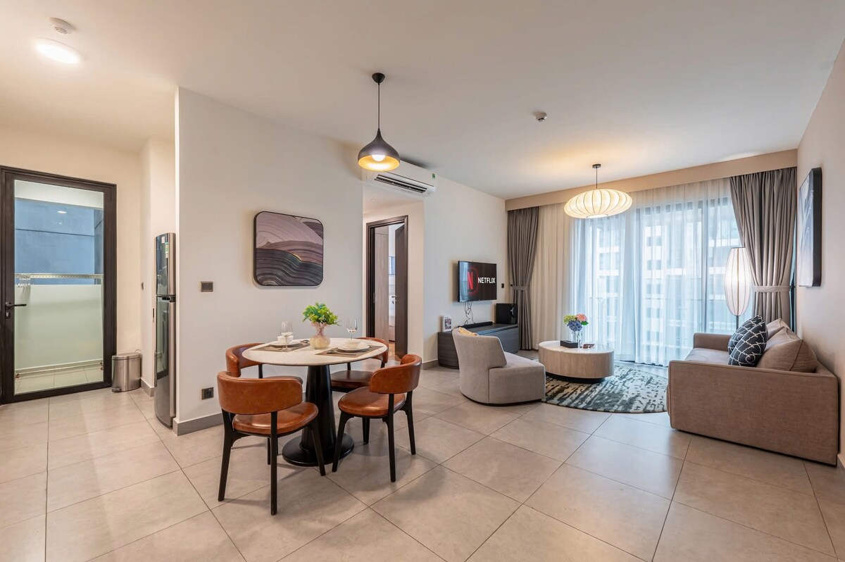 Cet appartement de luxe de 2 chambres est situé à Feliz En Vista, l'un des développements résidentiels les plus prestigieux de Thu Duc City. Les voyageurs bénéficient d'un accès complet aux équipements de style complexe hôtelier, notamment une grande piscine, une salle de sport moderne, des jardins paysagers et une sécurité 24h/24 et 7j/7. L'aménagement spacieux offre confort, intimité et environnement paisible tout en étant à quelques minutes du District 1 et de Thu Thiem, idéal pour les familles, les voyageurs d'affaires et les longs séjours.