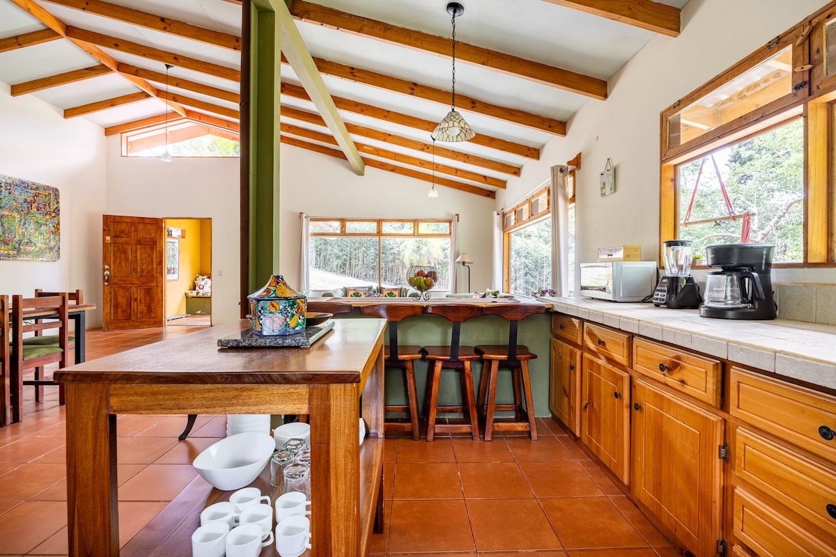 La maison est nichée dans une ferme privée à côté de la réserve de la forêt de nuages de Monteverde. Elle est située au sommet de la montagne avec une vue imprenable sur le golfe de Nicoya et le meilleur endroit pour regarder les couchers de soleil lorsque le temps le permet. C'est une maison non luxueuse d'une chambre qui a été construite par l'un des premiers colons quakers de la région de Monteverde. Elle est entièrement équipée avec une cuisine, un lave-linge et un sèche-linge pour le meilleur confort. Nous sommes dans la forêt de nuages, soyez prêt pour les changements climatiques et les insectes.